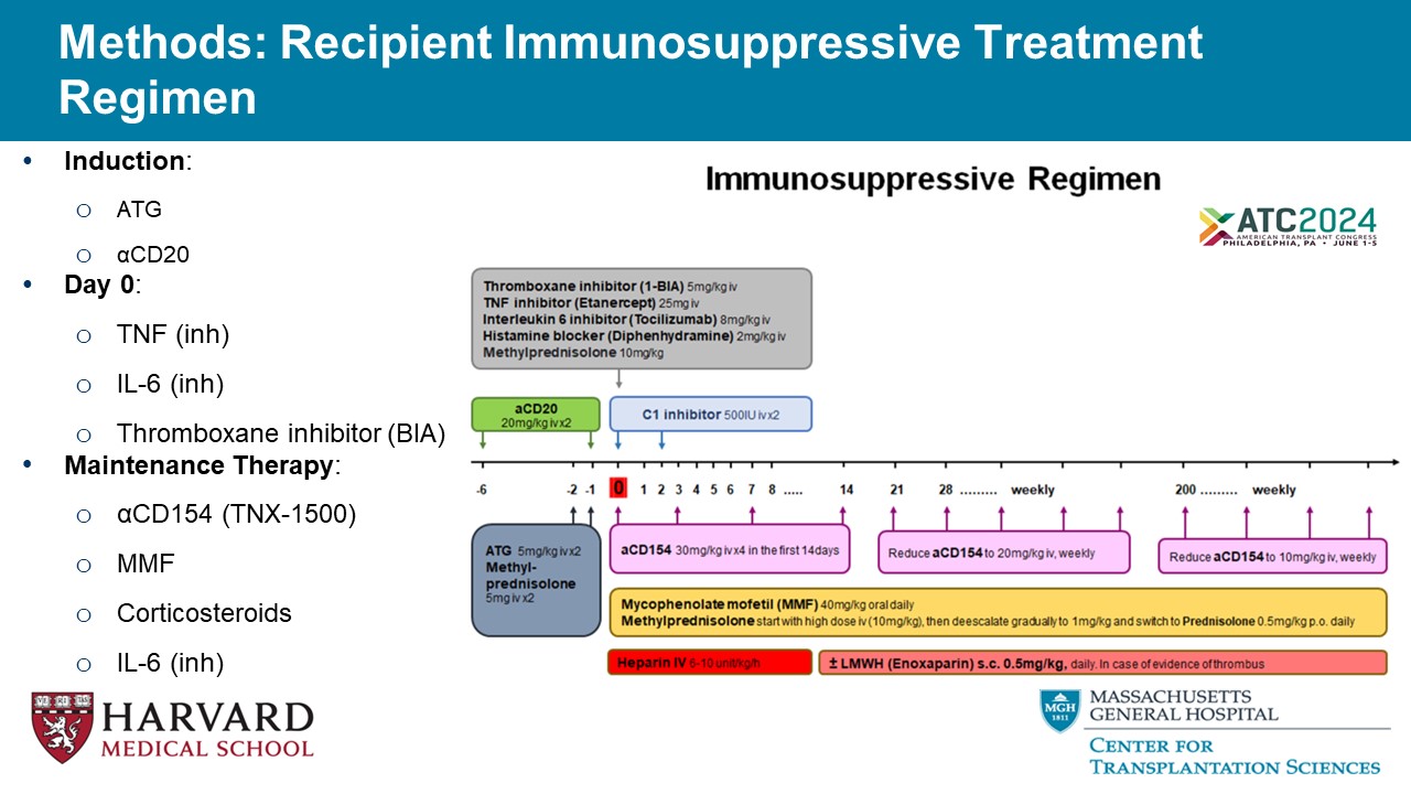 Methods: Recipient Immunosuppressive Treatment Regimen • Induction : o ATG o α CD20 • Day 0 : o TNF ( inh ) o IL - 6 ( inh ) o Thromboxane inhibitor (BIA) • Maintenance Therapy : o α CD154 (TNX - 1500) o MMF o Corticosteroids o IL - 6 ( inh )