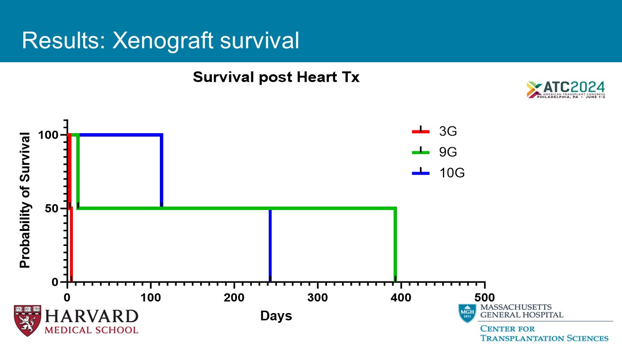 0 100 200 300 400 500 0 50 100 Survival post Heart Tx Days P r o b a b i l i t y o f S u r v i v a l 3G 9G 10G Results: Xenograft survival