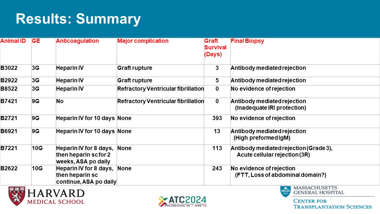 Results: Summary Final Biopsy Graft Survival (Days) Major complication Anticoagulation GE Animal ID Antibody mediated rejection 3 Graft rupture Heparin IV 3G B3022 Antibody mediated rejection 5 Graft rupture Heparin IV 3G B2922 No evidence of rejection 0 Refractory Ventricular fibrillation Heparin IV 3G B8522 Antibody mediated rejection (Inadequate IRI protection) 0 Refractory Ventricular fibrillation No 9G B7421 No evidence of rejection 393 None Heparin IV for 10 days 9G B2721 Antibody mediated rejection (High preformed IgM) 13 None Heparin IV for 10 days 9G B6921 Antibody mediated rejection (Grade 3), Acute cellular rejection (3R) 113 None Heparin IV for 8 days, then heparin sc for 2 weeks, ASA po daily 10G B7221 No evidence of rejection (FTT, Loss of abdominal domain?) 243 None Heparin IV for 8 days, then heparin sc continue, ASA po daily 10G B2622