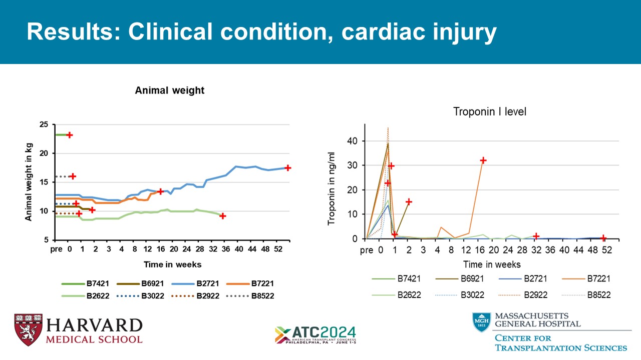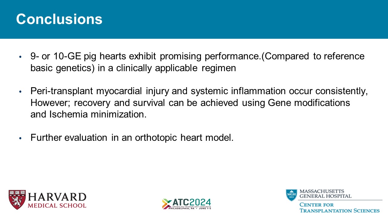 Conclusions • 9 - or 10 - GE pig hearts exhibit promising performance.(Compared to reference basic genetics) in a clinically applicable regimen • Peri - transplant myocardial injury and systemic inflammation occur consistently, However; recovery and survival can be achieved using Gene modifications and Ischemia minimization. • Further evaluation in an orthotopic heart model.