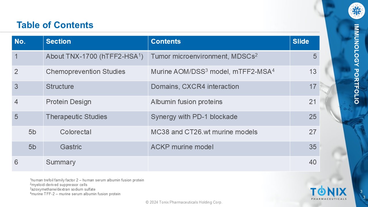 © 2023 Tonix Pharmaceuticals Holding Corp. 3 © 2024 Tonix Pharmaceuticals Holding Corp. IMMUNOLOGY PORTFOLIO Table of Contents 3 Slide Contents Section No. 5 Tumor microenvironment, MDSCs 2 About TNX - 1700 (hTFF2 - HSA 1 ) 1 13 Murine AOM/DSS 3 model, mTFF2 - MSA 4 Chemoprevention Studies 2 17 Domains, CXCR4 interaction Structure 3 21 Albumin fusion proteins Protein Design 4 25 Synergy with PD - 1 blockade Therapeutic Studies 5 27 MC38 and CT26.wt murine models Colorectal 5b 35 ACKP murine model Gastric 5b 40 Summary 6 1 human trefoil family factor 2 – human serum albumin fusion protein 2 myeloid - derived suppressor cells 3 azoxymethane/dextran sodium sulfate 4 murine TFF - 2 – murine serum albumin fusion protein