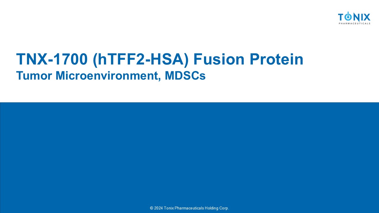 © 2023 Tonix Pharmaceuticals Holding Corp. © 2024 Tonix Pharmaceuticals Holding Corp. TNX - 1700 (hTFF2 - HSA) Fusion Protein Tumor Microenvironment, MDSCs