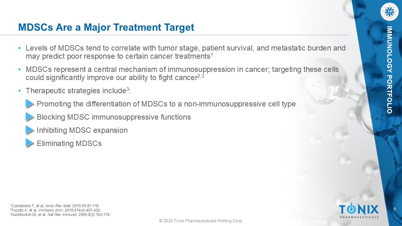 © 2023 Tonix Pharmaceuticals Holding Corp. 8 © 2024 Tonix Pharmaceuticals Holding Corp. IMMUNOLOGY PORTFOLIO Cancers Create Toxic, Immunosuppressive Tumor Microenvironments (TME) • Tumors are surrounded by endothelial and stroma cells, and invading immune cells, both innate and adaptive 1,2 • Complex regulatory network supports tumor growth, enabling cancers to thrive by evading immune surveillance and destruction 2 - 3 • The TME sabotages tumor - killing cytotoxic CD8 T cells 1 • Myeloid - derived suppressor cells (MDSCs) interfere with anticancer immunity 2,3 1 Belli C, et al. Cancer Treat Rev. 2018;65:22 - 32. 2 Roma - Rodriguez C, et al. Int J Mol Sci. 2019;20(4):840. 3 Tsai M, et al. ISRN Biochem . 2014:351959. Tumors Create a Toxic, Immunosuppressive Microenvironment 1 - 3 Key The TME supports tumor growth and enables cancers to thrive by evading immune surveillance and destruction Healthy cell Malignant cell Myeloid - derived suppressor cell (MDSC) Cancer - associated fibroblast Exhausted CD8 T cell Cytotoxic CD8 T cell CD4 T cell Dendritic cell (DC) B cell Natural Killer (NK) cell Macrophage Neutrophil