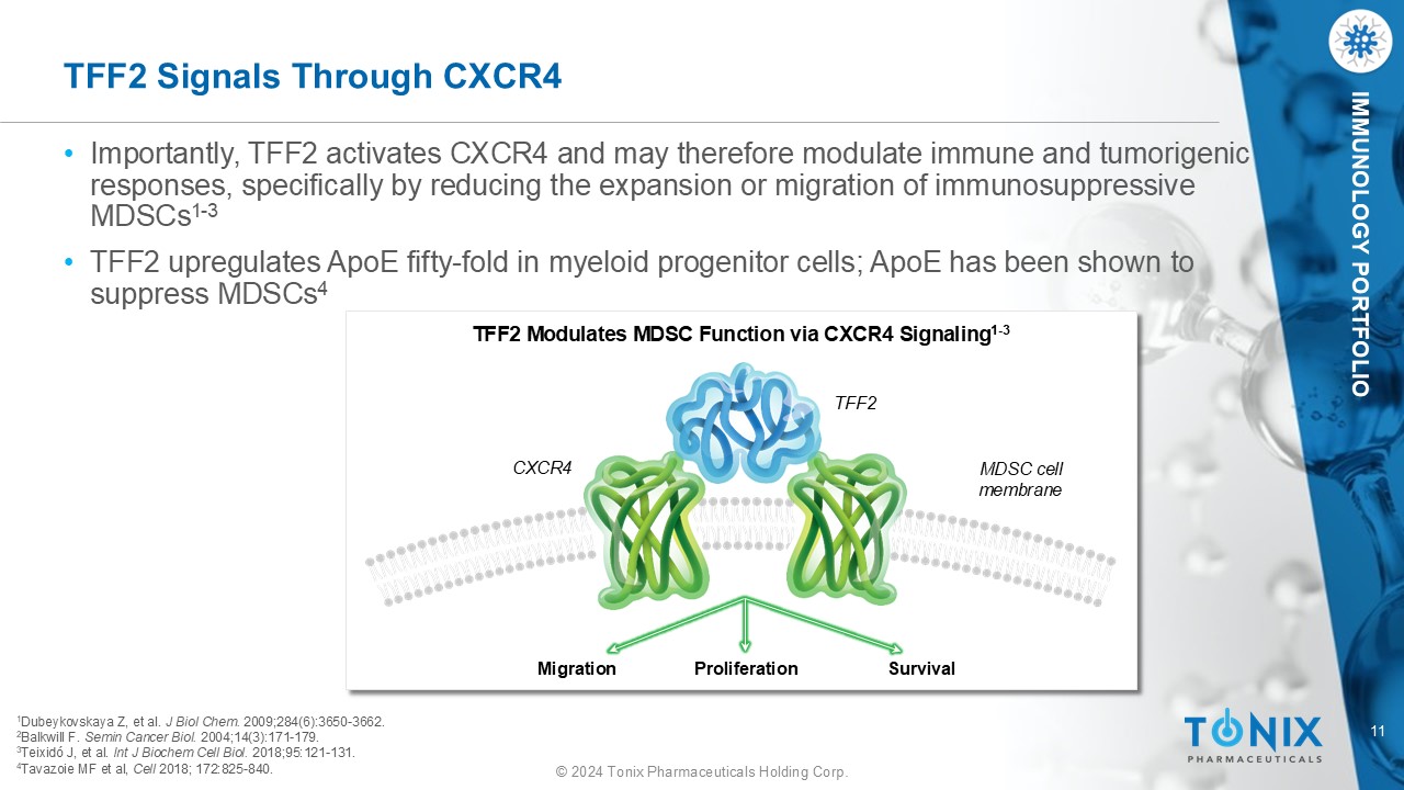 © 2023 Tonix Pharmaceuticals Holding Corp. 10 © 2024 Tonix Pharmaceuticals Holding Corp. IMMUNOLOGY PORTFOLIO Trefoil Family Factor 2 (rTFF2) and Cancer Biology • TFF2 is a small secreted protein ‒ Encoded by the TFF2 gene in humans ‒ Expressed in gastrointestinal mucosa where it functions to protect and repair mucosa ‒ TFF2 is also expressed at low levels in splenic memory T cells ‒ Upregulated in chronic inflammation ‒ Activates the chemokine receptor CXCR4 in cancer cells ▪ Blocked by AMD3100 (CXCR4 antagonist) or anti - CXCR4 mAb • TFF2 is epigenetically silenced in gastric cancer ‒ Postulated to protect against cancer development through multiple mechanisms ‒ Has effects on cancer cells and tumor microenvironment, including marked suppression of MDSCs ‒ Knockout of the TFF2 gene leads to faster tumor growth, while overexpression of TFF2 in T cells suppresses tumor growth in a manner dependent on CD8+ T cells.