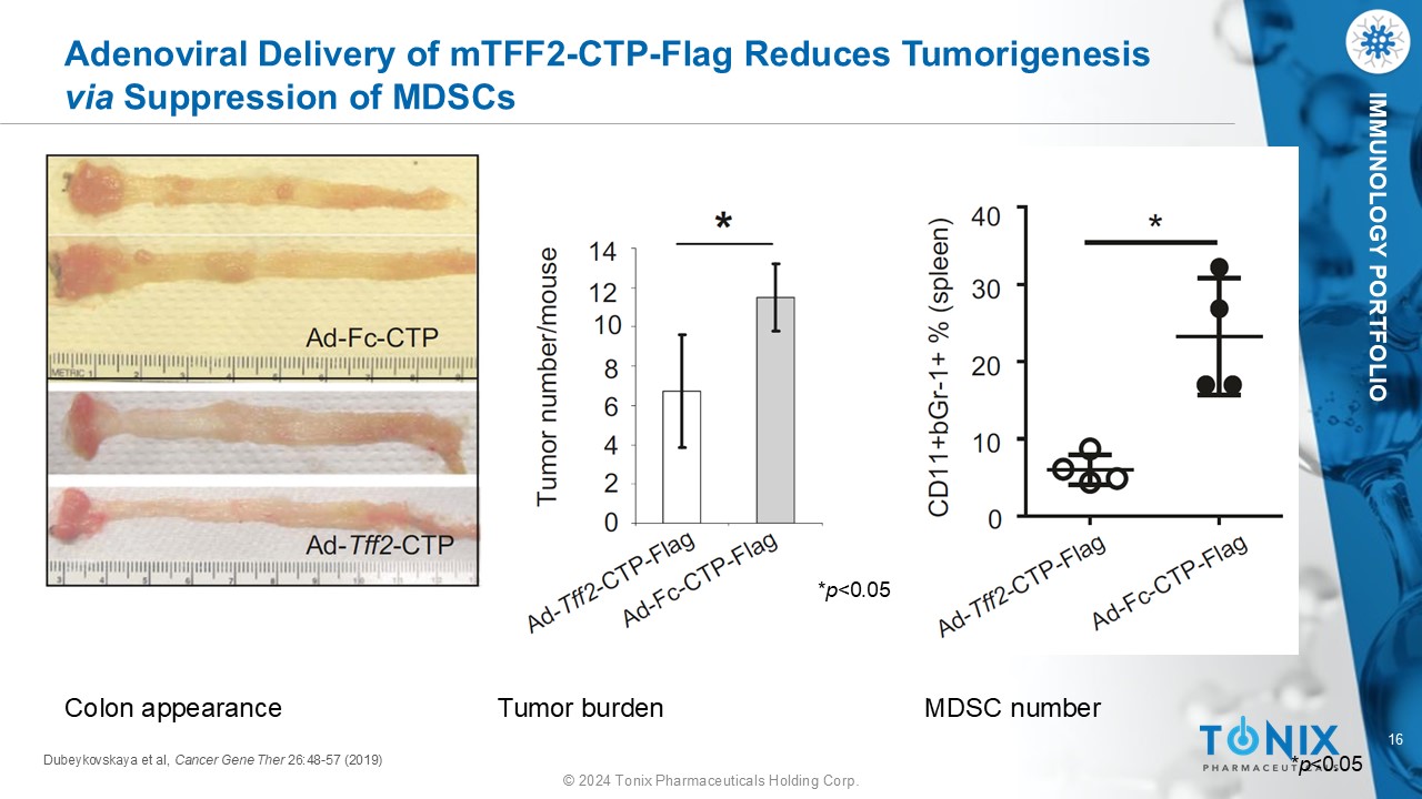 © 2023 Tonix Pharmaceuticals Holding Corp. 15 © 2024 Tonix Pharmaceuticals Holding Corp. IMMUNOLOGY PORTFOLIO Transgenic Overexpression of mTFF2 Reduces Tumorigenesis via Suppression of MDSCs Dubeykovskaya Z, et al. Nat Commun . 2016 7:1 - 11 MDSC number Colon appearance Tumor burden * p <0.05, ** p <0.01, *** p <0.001, **** p <0.0001
