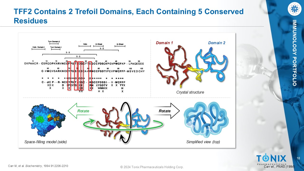 © 2023 Tonix Pharmaceuticals Holding Corp. 18 © 2024 Tonix Pharmaceuticals Holding Corp. IMMUNOLOGY PORTFOLIO TFF2 Contains 2 Trefoil Domains, Each Containing 5 Conserved Residues Carr et., PNAS (1994) Crystal structure Simplified view (top) Rotate Rotate Space - filling model (side) Domain 1 Domain 2 Carr M, et al. Biochemistry , 1994 91:2206 - 2210