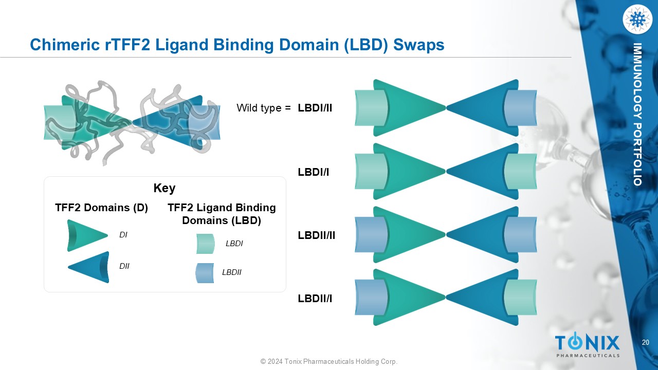 © 2023 Tonix Pharmaceuticals Holding Corp. 19 © 2024 Tonix Pharmaceuticals Holding Corp. IMMUNOLOGY PORTFOLIO Chimeric rTFF2 Domain (D) Swaps Key TFF2 Domains (D) DI DII TFF2 Ligand Binding Domains (LBD) LBDI LBDII Wild type = DI/II DI/I DII/II DII/I