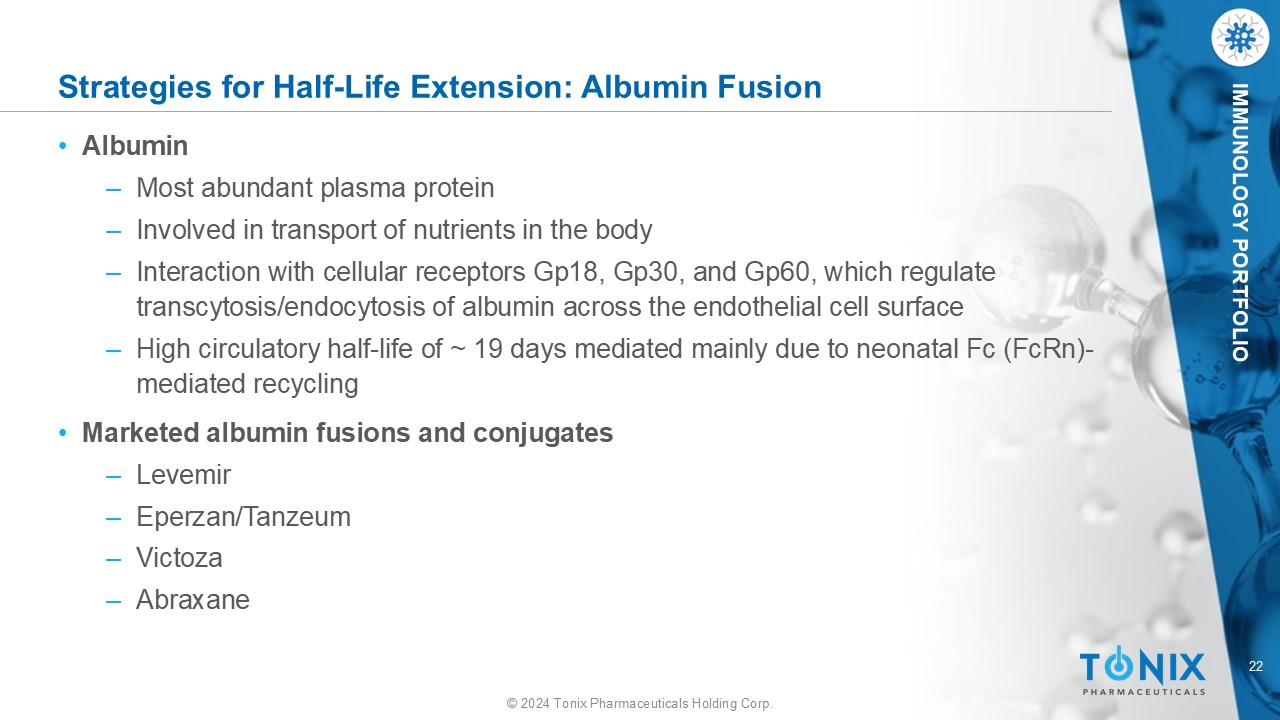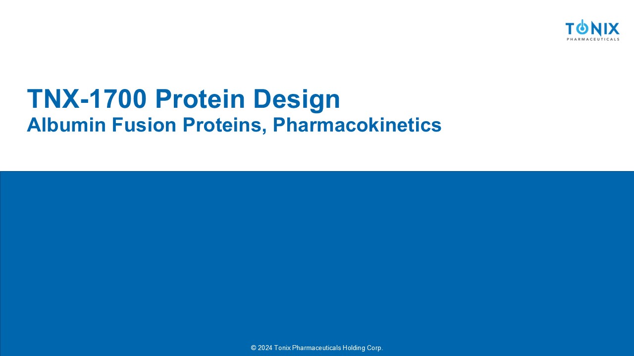 © 2023 Tonix Pharmaceuticals Holding Corp. © 2024 Tonix Pharmaceuticals Holding Corp. TNX - 1700 Protein Design Albumin Fusion Proteins, Pharmacokinetics