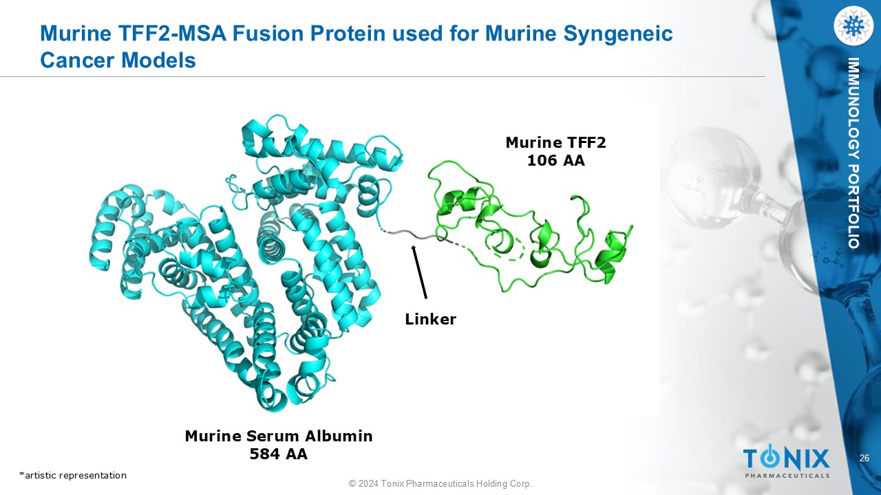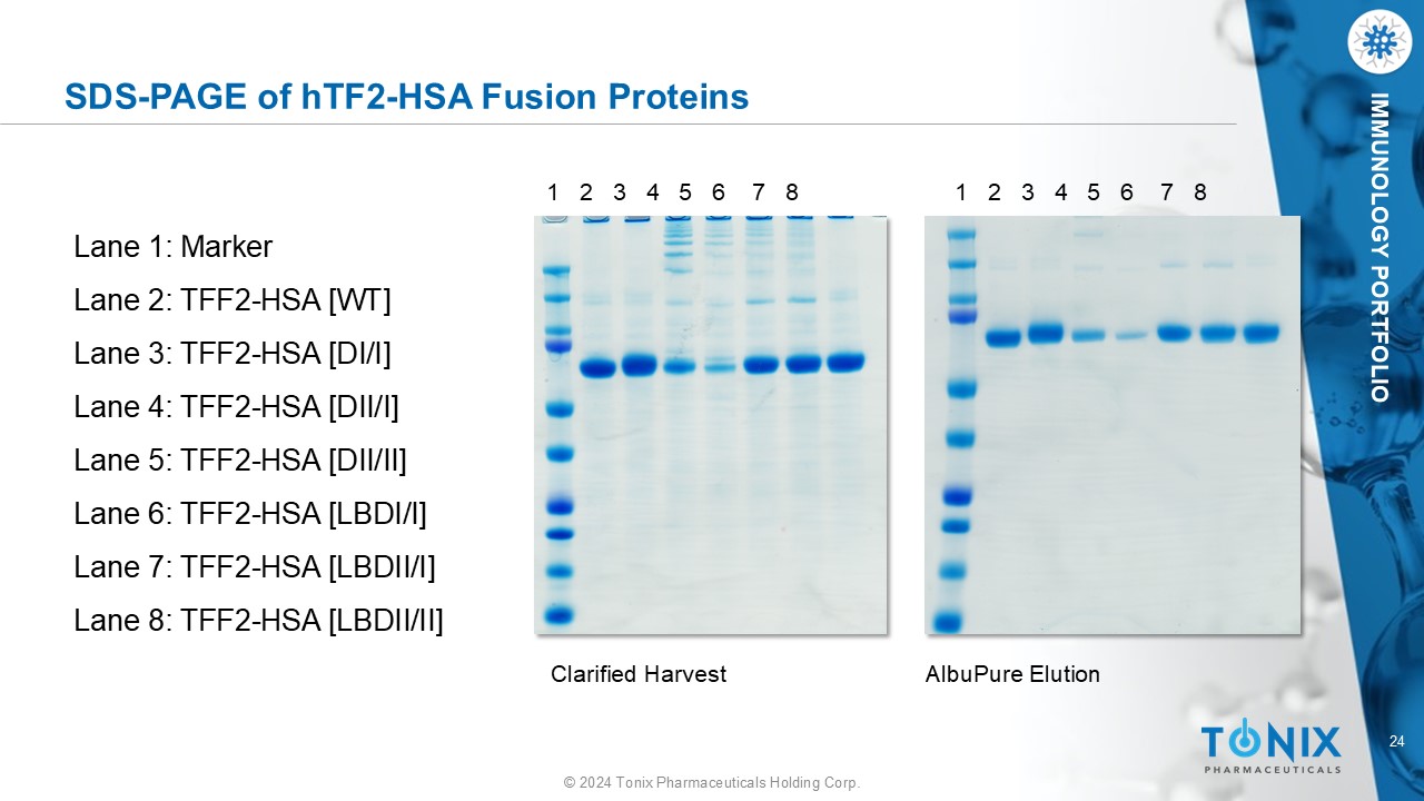 © 2023 Tonix Pharmaceuticals Holding Corp. 23 © 2024 Tonix Pharmaceuticals Holding Corp. IMMUNOLOGY PORTFOLIO hTFF2 - HSA Fusion Protein hTFF2 Human Serum Albumin Predicted Mw ~ 78,000 daltons