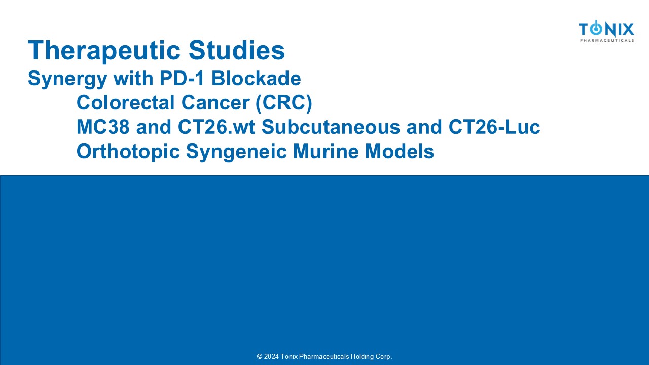 © 2023 Tonix Pharmaceuticals Holding Corp. © 2024 Tonix Pharmaceuticals Holding Corp. Therapeutic Studies Synergy with PD - 1 Blockade Colorectal Cancer (CRC) MC38 and CT26.wt Subcutaneous and CT26 - Luc Orthotopic Syngeneic Murine Models