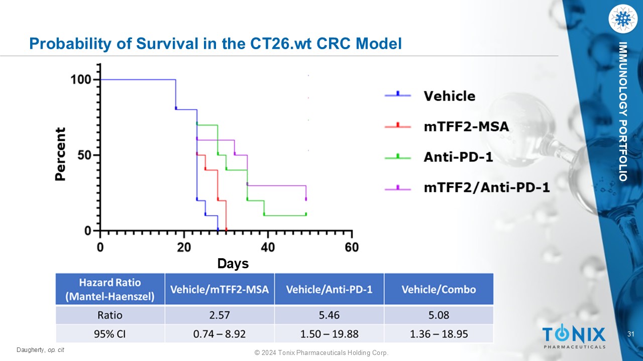 © 2023 Tonix Pharmaceuticals Holding Corp. 30 © 2024 Tonix Pharmaceuticals Holding Corp. IMMUNOLOGY PORTFOLIO Inhibition of Tumor Growth in the CT26.wt CRC Model Days on Study Daugherty, op. cit