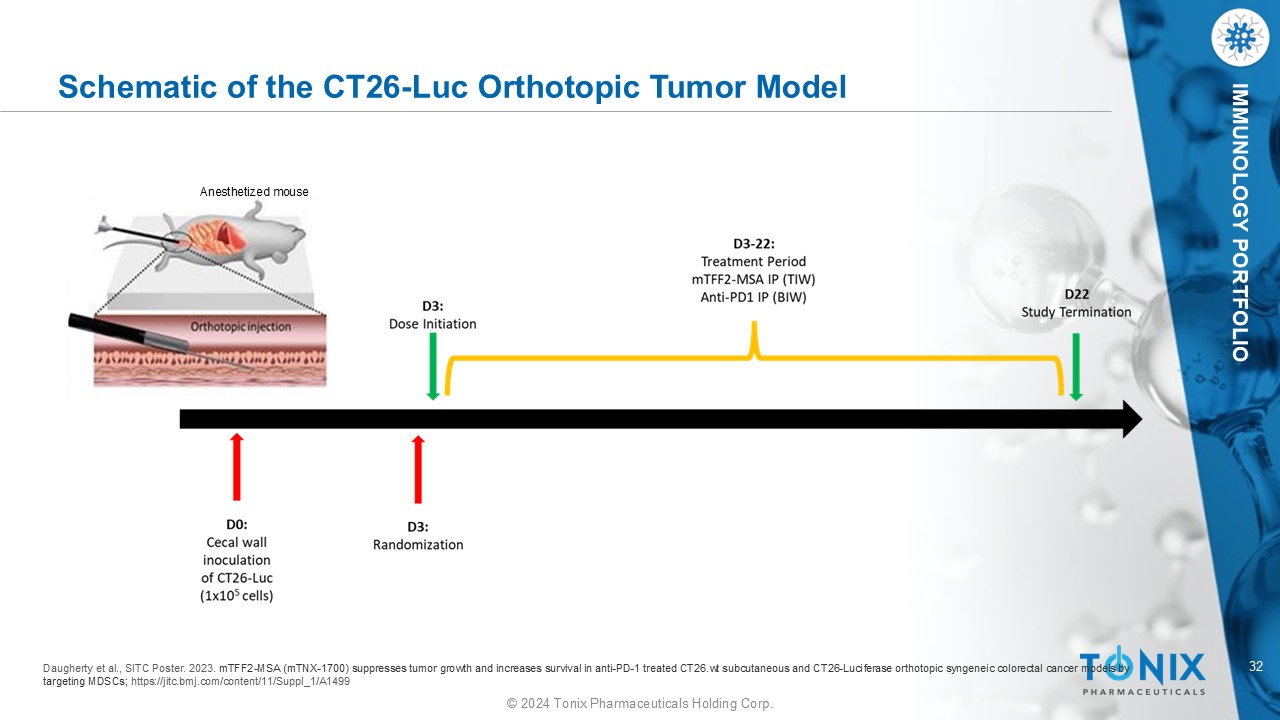 © 2023 Tonix Pharmaceuticals Holding Corp. 31 © 2024 Tonix Pharmaceuticals Holding Corp. IMMUNOLOGY PORTFOLIO Probability of Survival in the CT26.wt CRC Model Days Daugherty, op. cit