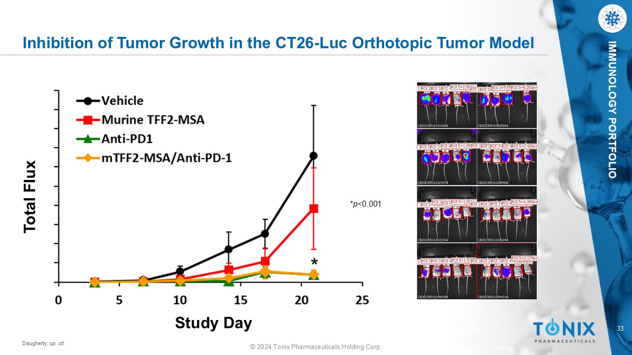 © 2023 Tonix Pharmaceuticals Holding Corp. 32 © 2024 Tonix Pharmaceuticals Holding Corp. IMMUNOLOGY PORTFOLIO Schematic of the CT26 - Luc Orthotopic Tumor Model Anesthetized mouse Daugherty et al., SITC Poster. 2023. mTFF2 - MSA (mTNX - 1700) suppresses tumor growth and increases survival in anti - PD - 1 treated CT26.wt subcutaneous and CT26 - Lucifera se orthotopic syngeneic colorectal cancer models by targeting MDSCs; https://jitc.bmj.com/content/11/Suppl_1/A1499