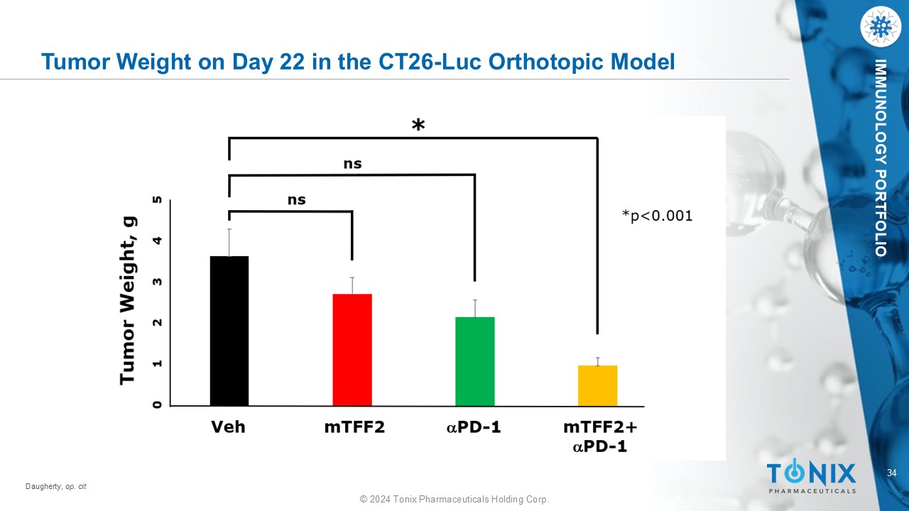© 2023 Tonix Pharmaceuticals Holding Corp. 33 © 2024 Tonix Pharmaceuticals Holding Corp. IMMUNOLOGY PORTFOLIO Inhibition of Tumor Growth in the CT26 - Luc Orthotopic Tumor Model Total Flux Study Day * * p <0.001 Daugherty, op. cit