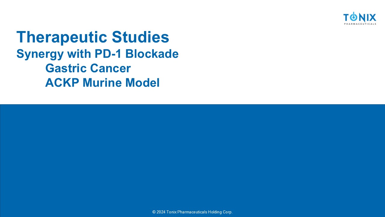 © 2023 Tonix Pharmaceuticals Holding Corp. © 2024 Tonix Pharmaceuticals Holding Corp. Therapeutic Studies Synergy with PD - 1 Blockade Gastric Cancer ACKP Murine Model