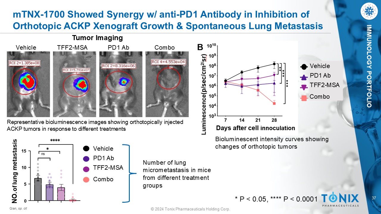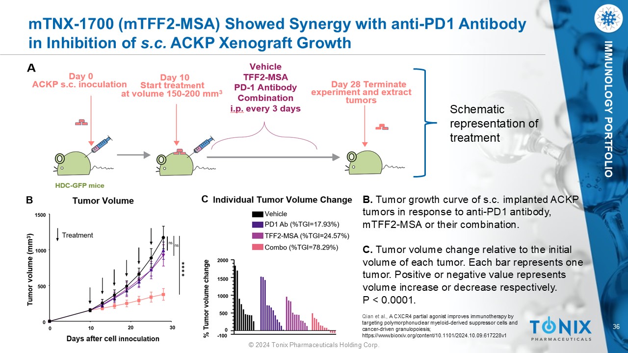 © 2023 Tonix Pharmaceuticals Holding Corp. 36 © 2024 Tonix Pharmaceuticals Holding Corp. IMMUNOLOGY PORTFOLIO mTNX - 1700 (mTFF2 - MSA) Showed Synergy with anti - PD1 Antibody in Inhibition of s.c. ACKP Xenograft Growth B. Tumor growth curve of s.c. implanted ACKP tumors in response to anti - PD1 antibody, mTFF2 - MSA or their combination. C. Tumor volume change relative to the initial volume of each tumor. Each bar represents one tumor. Positive or negative value represents volume increase or decrease respectively. P < 0.0001. Schematic representation of treatment Qian et al., A CXCR4 partial agonist improves immunotherapy by targeting polymorphonuclear myeloid - derived suppressor cells and cancer - driven granulopoiesis; https://www.biorxiv.org/content/10.1101/2024.10.09.617228v1