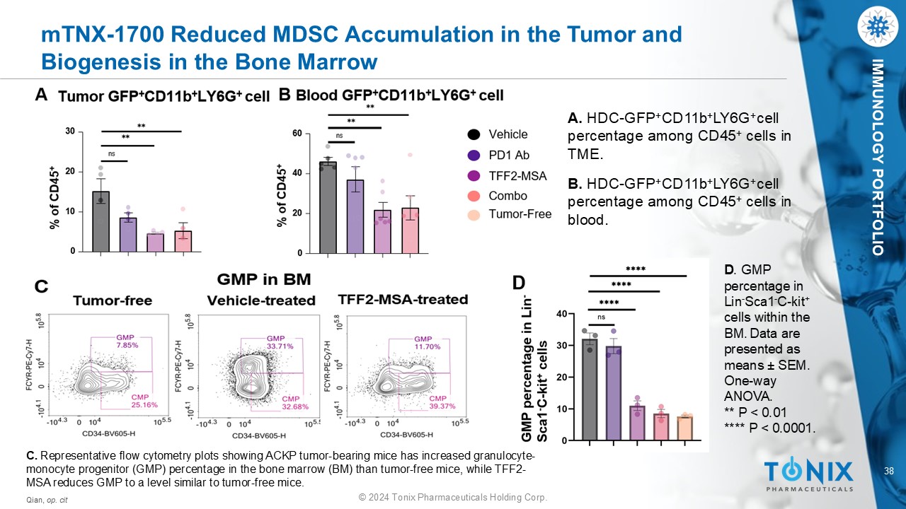 © 2023 Tonix Pharmaceuticals Holding Corp. 38 © 2024 Tonix Pharmaceuticals Holding Corp. IMMUNOLOGY PORTFOLIO mTNX - 1700 Reduced MDSC Accumulation in the Tumor and Biogenesis in the Bone Marrow A. HDC - GFP + CD11b + LY6G + cell percentage among CD45 + cells in TME. B. HDC - GFP + CD11b + LY6G + cell percentage among CD45 + cells in blood. D . GMP percentage in Lin - Sca1 - C - kit + cells within the BM. Data are presented as means ± SEM. One - way ANOVA. ** P < 0.01 **** P < 0.0001. C. Representative flow cytometry plots showing ACKP tumor - bearing mice has increased granulocyte - monocyte progenitor (GMP) percentage in the bone marrow (BM) than tumor - free mice, while TFF2 - MSA reduces GMP to a level similar to tumor - free mice. Qian, op. cit