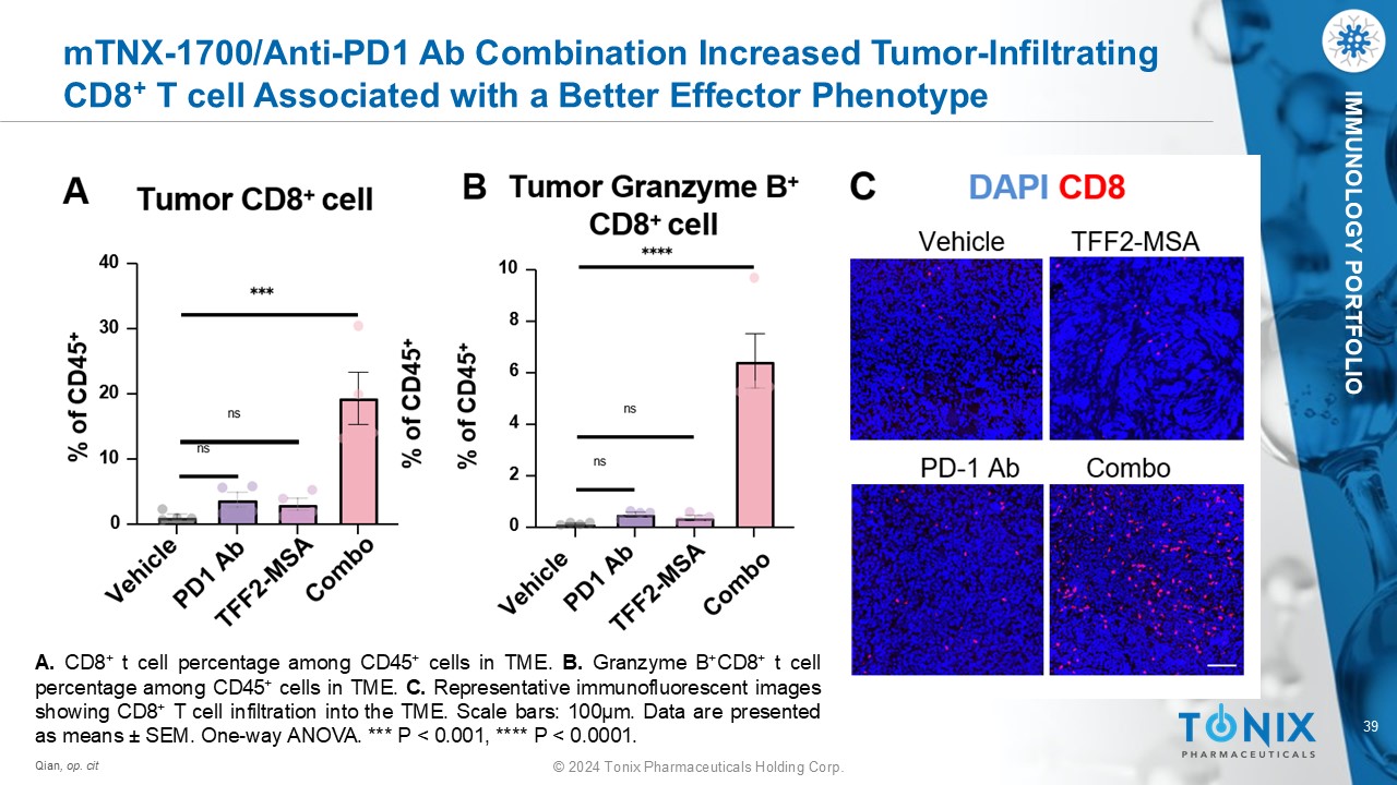 © 2023 Tonix Pharmaceuticals Holding Corp. 39 © 2024 Tonix Pharmaceuticals Holding Corp. IMMUNOLOGY PORTFOLIO mTNX - 1700/Anti - PD1 Ab Combination Increased Tumor - Infiltrating CD8 + T cell Associated with a Better Effector Phenotype A . CD 8 + t cell percentage among CD 45 + cells in TME . B . Granzyme B + CD 8 + t cell percentage among CD 45 + cells in TME . C . Representative immunofluorescent images showing CD 8 + T cell infiltration into the TME . Scale bars : 100 μ m . Data are presented as means ± SEM . One - way ANOVA . *** P < 0 . 001 , **** P < 0 . 0001 . Qian , op. cit