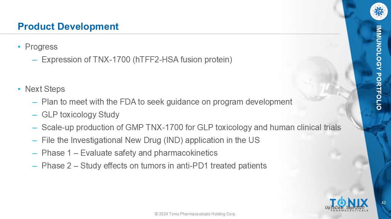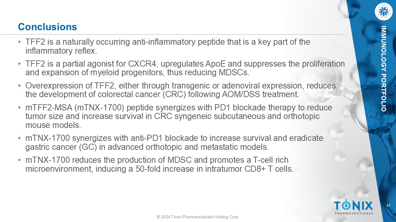 © 2023 Tonix Pharmaceuticals Holding Corp. 41 © 2024 Tonix Pharmaceuticals Holding Corp. IMMUNOLOGY PORTFOLIO Conclusions • TFF2 is a naturally occurring anti - inflammatory peptide that is a key part of the inflammatory reflex. • TFF2 is a partial agonist for CXCR4, upregulates ApoE and suppresses the proliferation and expansion of myeloid progenitors, thus reducing MDSCs. • Overexpression of TFF2, either through transgenic or adenoviral expression, reduces the development of colorectal cancer (CRC) following AOM/DSS treatment. • mTFF2 - MSA (mTNX - 1700) peptide synergizes with PD1 blockade therapy to reduce tumor size and increase survival in CRC syngeneic subcutaneous and orthotopic mouse models. • mTNX - 1700 synergizes with anti - PD1 blockade to increase survival and eradicate gastric cancer (GC) in advanced orthotopic and metastatic models. • mTNX - 1700 reduces the production of MDSC and promotes a T - cell rich microenvironment, inducing a 50 - fold increase in intratumor CD8+ T cells.