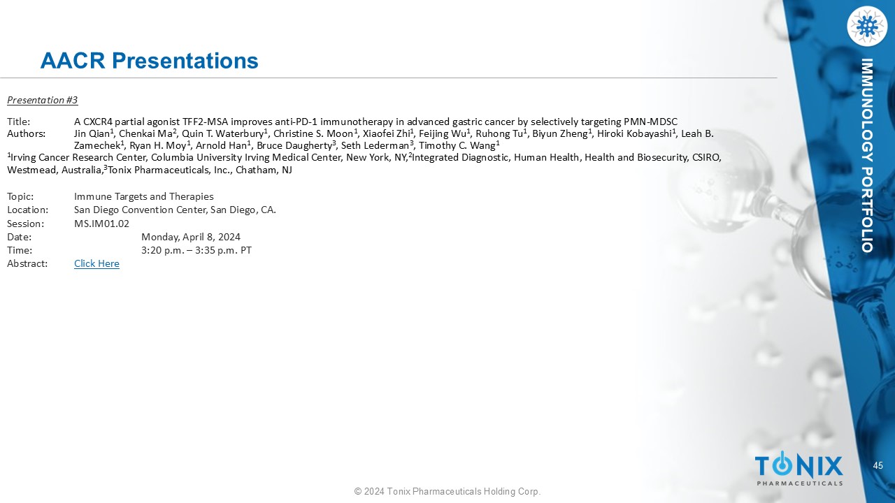 © 2023 Tonix Pharmaceuticals Holding Corp. 44 © 2024 Tonix Pharmaceuticals Holding Corp. IMMUNOLOGY PORTFOLIO AACR Presentations Presentation # 1 Title: MDSC - targeted TFF2 - MSA suppresses tumor growth and increases survival in anti - PD - 1 treated MC38 and CT26.wt murine color ectal cancer models Authors: Bruce L. Daugherty 1 , Rebecca J. Boohaker 2 , Rebecca Johnstone 2 , Karr Stinson 2 , Jin Qian 3 , Timothy C. Wang 3 , Seth Lederman 1 Tonix Pharmaceuticals, Inc., 26 Main Street, Suite 101, Chatham, NJ 07928 Southern Research, 2000 9 th Ave S, Birmingham, AL 35205 Division of Digestive and Liver Diseases, Irving Cancer Research Center, Columbia University Medical Center, New York, NY 100 32, USA Topic: Oncolytic Viruses, Anticancer Vaccines, and Other Immunomodulatory Therapies Location: Orange County Convention Center, Orlando, Fla. Section: 24, #704 Date: Sunday, April 16, 2023 Time: 1:30 p.m. – 5:00 p.m. ET Abstract: Click here Presentation #2 Title : MDSC - targeted TFF 2 - MSA synergizes with PD - 1 blockade therapy in diffuse - type gastric cancer Authors: Jin Qian 1 , Sandra Ryeom 1 , Bruce Daugherty 2 , Seth Lederman 2 , Timothy C. Wang 2. Division of Digestive and Liver Diseases, Irving Cancer Research Center, Columbia University Medical Center, New York, NY 100 32, USA Tonix Pharmaceuticals, Inc., 26 Main Street, Suite 101, Chatham, NJ 07928 Title: Combination Immunotherapies 1 Location: Orange County Convention Center, Orlando, Fla. Section: 21, #5088 Date: Tuesday, April 18, 2023 Time: 1:30 p.m. – 5:00 p.m. ET Abstract: Click here
