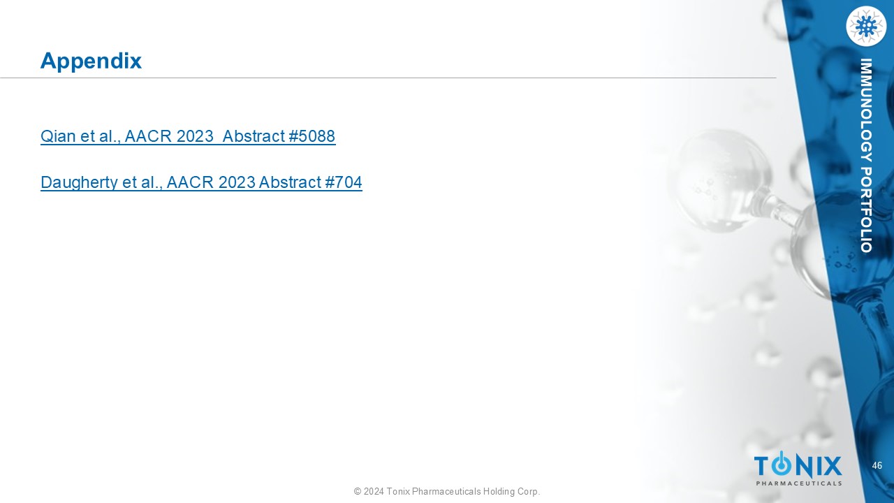 © 2023 Tonix Pharmaceuticals Holding Corp. 46 © 2024 Tonix Pharmaceuticals Holding Corp. IMMUNOLOGY PORTFOLIO Appendix Daugherty et al., AACR 2023 Abstract #704 Qian et al., AACR 2023_Abstract #5088