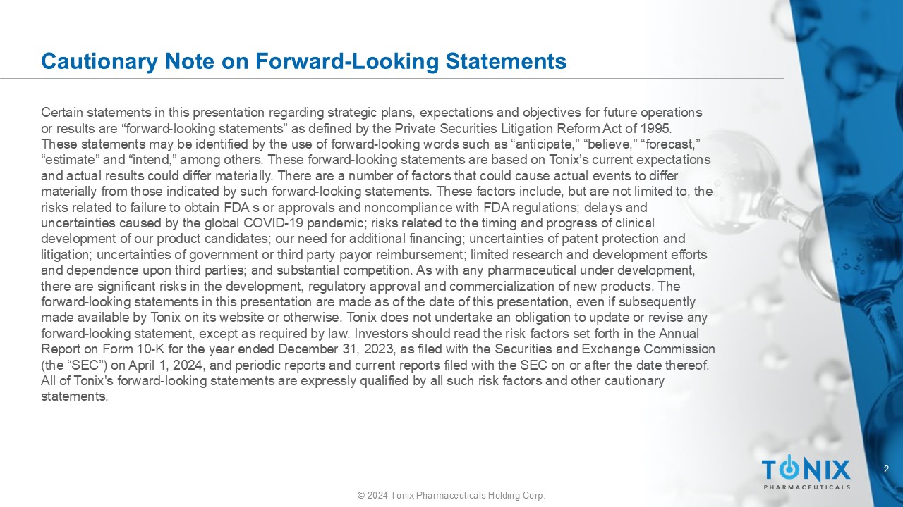 2 © 2024 Tonix Pharmaceuticals Holding Corp. Cautionary Note on Forward - Looking Statements Certain statements in this presentation regarding strategic plans, expectations and objectives for future operations or results are “forward - looking statements” as defined by the Private Securities Litigation Reform Act of 1995. These statements may be identified by the use of forward - looking words such as “anticipate,” “believe,” “forecast,” “estimate” and “intend,” among others. These forward - looking statements are based on Tonix’s current expectations and actual results could differ materially. There are a number of factors that could cause actual events to differ materially from those indicated by such forward - looking statements. These factors include, but are not limited to, the risks related to failure to obtain FDA s or approvals and noncompliance with FDA regulations; delays and uncertainties caused by the global COVID - 19 pandemic; risks related to the timing and progress of clinical development of our product candidates; our need for additional financing; uncertainties of patent protection and litigation; uncertainties of government or third party payor reimbursement; limited research and development efforts and dependence upon third parties; and substantial competition. As with any pharmaceutical under development, there are significant risks in the development, regulatory approval and commercialization of new products. The forward - looking statements in this presentation are made as of the date of this presentation, even if subsequently made available by Tonix on its website or otherwise. Tonix does not undertake an obligation to update or revise any forward - looking statement, except as required by law. Investors should read the risk factors set forth in the Annual Report on Form 10 - K for the year ended December 31, 2023, as filed with the Securities and Exchange Commission (the “SEC”) on April 1, 2024, and periodic reports and current reports filed with the SEC on or after the date thereof. All of Tonix's forward - looking statements are expressly qualified by all such risk factors and other cautionary statements.