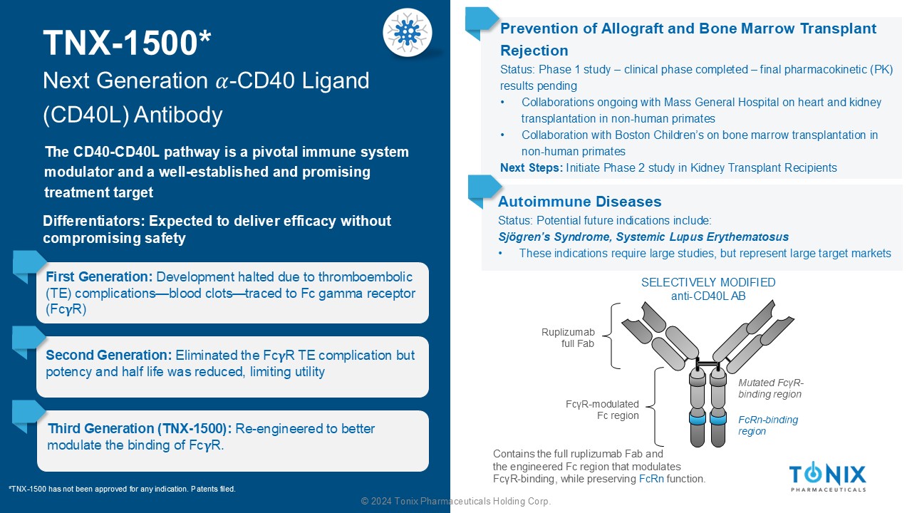 © 2024 Tonix Pharmaceuticals Holding Corp. TNX - 1500* Next Generation ߙ - CD40 Ligand (CD40L) Antibody The CD40 - CD40L pathway is a pivotal immune system modulator and a well - established and promising treatment target First Generation: Development halted due to thromboembolic (TE) complications — blood clots — traced to Fc gamma receptor (Fc ઻ R) Prevention of Allograft and Bone Marrow Transplant Rejection Status: Phase 1 study – clinical phase completed – final pharmacokinetic (PK) results pending • Collaborations ongoing with Mass General Hospital on heart and kidney transplantation in non - human primates • Collaboration with Boston Children’s on bone marrow transplantation in non - human primates Next Steps: Initiate Phase 2 study in Kidney Transplant Recipients SELECTIVELY MODIFIED anti - CD40L AB Ruplizumab full Fab Contains the full ruplizumab Fab and the engineered Fc region that modulates Fc γ R - binding, while preserving FcRn function. Mutated Fc γ R - binding region FcRn - binding region Fc γ R - modulated Fc region Second Generation: Eliminated the Fc ઻ R TE complication but potency and half life was reduced, limiting utility Third Generation (TNX - 1500): Re - engineered to better modulate the binding of Fc ઻ R. *TNX - 1500 has not been approved for any indication. Patents filed. Differentiators: Expected to deliver efficacy without compromising safety Autoimmune Diseases Status: Potential future indications include: Sjögren’s Syndrome, Systemic Lupus Erythematosus • These indications require large studies, but represent large target markets