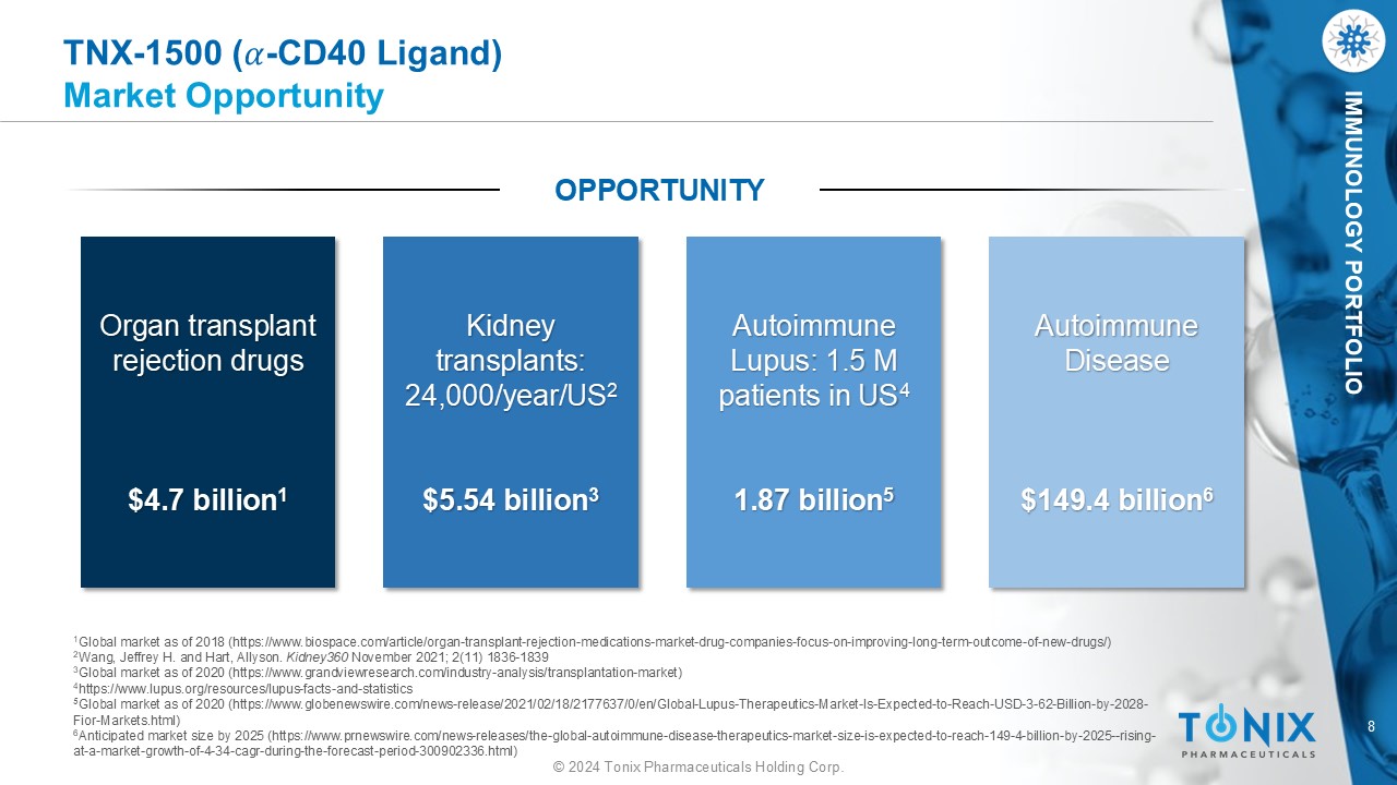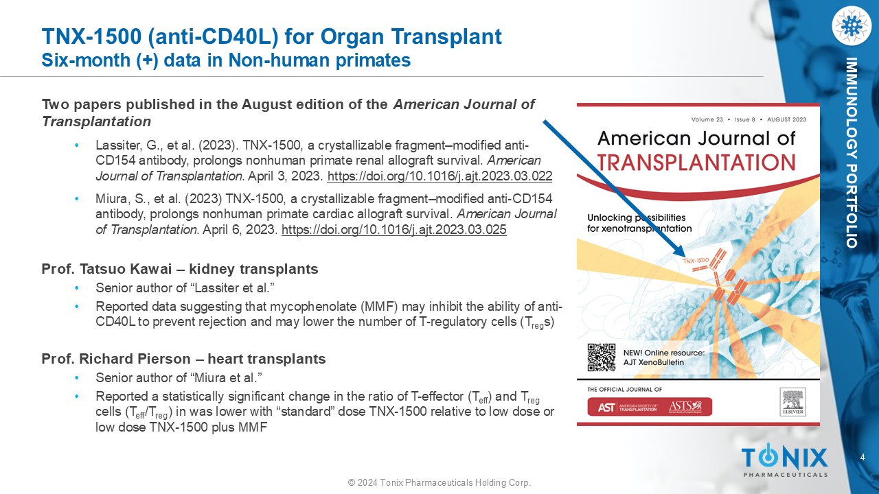 7 © 2024 Tonix Pharmaceuticals Holding Corp. IMMUNOLOGY PORTFOLIO TNX - 1500 Preclinical Data and Publications Non - human Primate Kidney Allo - Transplantation • TNX - 1500 monotherapy consistently prevents kidney transplant rejection with n o thrombosis observed • April 2023 Publication: Lassiter, G., et al. (2023). TNX - 1500, an Fc - modified Anti - CD154 Antibody, Prolongs Nonhuman Primate Renal Allograft Survival. American Journal of Transplantation . www.sciencedirect.com/science/article/pii/S1600613523003714 Non - human Primate Heart Heterotopic Allo - Transplantation • TNX - 1500 monotherapy consistently prevents heart transplant rejection. Similar activity to chimeric hu5c8 2 during treatment phase in prior studies • April 2023 Publication: Miura, S., et al. (2023) TNX - 1500, an Fc - modified Anti - CD154 Antibody, Prolongs Nonhuman Primate Cardiac Allograft Survival. American Journal of Transplantation. www.sciencedirect.com/science/article/pii/S1600613523003969 Non - Human Primate Kidney Xenograft Transplantation • TNX - 1500 therapy is part of a regiment to prevent rejection in kidney xenograft transplants ‒ Anand, R.P., Layer, J.V., Heja , D. et al. (2023). Design and testing of a humanized porcine donor for xenotransplantation. Nature. https://www.nature.com/articles/s41586 - 023 - 06594 - 4 ‒ Kozlov, M. (2023). Monkey survives two years after gene - edited pig - kidney transplant. Nature. https://www.nature.com/articles/d41586 - 023 - 03176 - 2 ‒ Mohiuddin, M. (2023). Pig - to - primate organ transplants require genetic modifications of donor. Nature. https://www.nature.com/articles/d41586 - 023 - 02817 - w