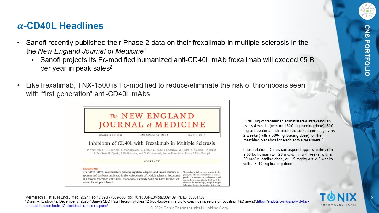 4 © 2024 Tonix Pharmaceuticals Holding Corp. IMMUNOLOGY PORTFOLIO TNX - 1500 (anti - CD40L) for Organ Transplant Six - month (+) data in Non - human primates Two papers published in the August edition of the American Journal of Transplantation • Lassiter, G., et al. (2023). TNX - 1500, a crystallizable fragment – modified anti - CD154 antibody, prolongs nonhuman primate renal allograft survival. American Journal of Transplantation . April 3, 2023. https://doi.org/10.1016/j.ajt.2023.03.022 • Miura, S., et al. (2023) TNX - 1500, a crystallizable fragment – modified anti - CD154 antibody, prolongs nonhuman primate cardiac allograft survival. American Journal of Transplantation . April 6, 2023. https://doi.org/10.1016/j.ajt.2023.03.025 Prof. Tatsuo Kawai – kidney transplants • Senior author of “Lassiter et al.” • Reported data suggesting that mycophenolate (MMF) may inhibit the ability of anti - CD40L to prevent rejection and may lower the number of T - regulatory cells (T reg s) Prof. Richard Pierson – heart transplants • Senior author of “Miura et al.” • Reported a statistically significant change in the ratio of T - effector (T eff ) and T reg cells ( T eff / T reg ) in was lower with “standard” dose TNX - 1500 relative to low dose or low dose TNX - 1500 plus MMF