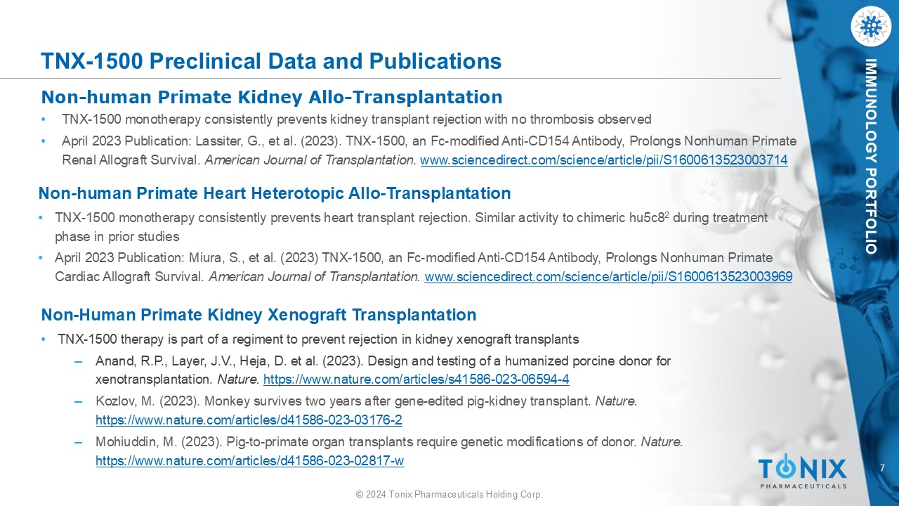 6 © 2024 Tonix Pharmaceuticals Holding Corp. CNS PORTFOLIO ࢻ - CD40L Headlines • Mass General Hospital just transplanted a genetically engineered pig kidney into a living human 1 • Boston Globe, March 21, 2024 • Patient’s death announced May 11, 2024 2 • The patient is being treated with anti - CD40L mAb tegoprubart from Eledon 1 • Some of the preclinical work was performed with TNX - 1500 3 • Mass General plans to perform allo kidney transplants with TNX - 1500 under investigator - initiated IND 1 Massachusetts General Hospital press release. March 21, 2024. “World’s First Genetically Edited Pig Kidney Transplant into Living Recipient Performed at Massachusetts General Hospital.” www.massgeneral.org/news/press - release/worlds - first - genetically - edited - pig - kidney - transplant - into - living - recipient (accessed March 29, 2024) 2 Stoico , N. Boston Globe . May 11, 2023. “Mass Man who received first kidney transplant from genetically engineered pig has died, family says”. 3 Anand, R.P., et al Nature. 622, 393 – 401 (2023). https://doi.org/10.1038/s41586 - 023 - 06594 - 4