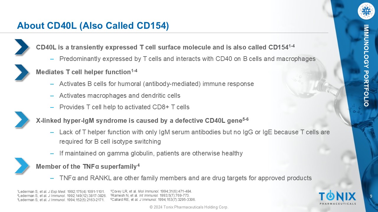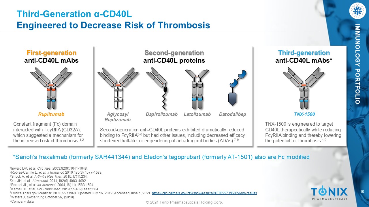 9 © 2024 Tonix Pharmaceuticals Holding Corp. IMMUNOLOGY PORTFOLIO About CD40L (Also Called CD154) CD40L is a transiently expressed T cell surface molecule and is also called CD154 1 - 4 ‒ Predominantly expressed by T cells and interacts with CD40 on B cells and macrophages Mediates T cell helper function 1 - 4 ‒ Activates B cells for humoral (antibody - mediated) immune response ‒ Activates macrophages and dendritic cells ‒ Provides T cell help to activated CD8+ T cells X - linked hyper - IgM syndrome is caused by a defective CD40L gene 5 - 6 ‒ Lack of T helper function with only IgM serum antibodies but no IgG or IgE because T cells are required for B cell isotype switching ‒ If maintained on gamma globulin, patients are otherwise healthy Member of the TNF α superfamily 4 ‒ TNF α and RANKL are other family members and are drug targets for approved products 1 Lederman S, et al. J Exp Med . 1992;175(4):1091 - 1101. 2 Lederman S, et al. J Immunol . 1992;149(12):3817 - 3826. 3 Lederman S, et al. J Immunol . 1994;152(5):2163 - 2171. 4 Covey LR, et al. Mol Immunol . 1994;31(6):471 - 484. 5 Ramesh N, et al. Int Immunol . 1993;5(7):769 - 773. 6 Callard RE, et al. J Immunol . 1994;153(7):3295 - 3306.