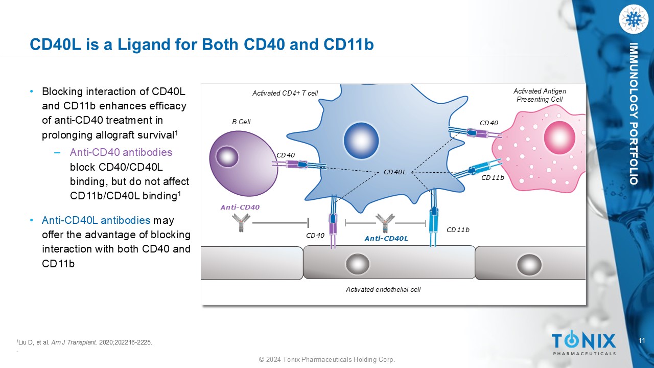10 © 2024 Tonix Pharmaceuticals Holding Corp. IMMUNOLOGY PORTFOLIO Third - Generation α - CD40L Engineered to Decrease Risk of Thrombosis First - generation anti - CD40L mAbs Constant fragment (Fc) domain interacted with FcγRIIA (CD32A), which suggested a mechanism for the increased risk of thrombosis. 1,2 Ruplizumab Second - generation anti - CD40L proteins Second - generation anti - CD40L proteins exhibited dramatically reduced binding to FcγRIIA 3 - 6 but had other issues, including decreased efficacy, shortened half - life, or engendering of anti - drug antibodies (ADAs). 7 - 9 Dapirolizumab Letolizumab Aglycosyl Ruplizumab Third - generation anti - CD40L mAbs * TNX - 1500 is engineered to target CD40L therapeutically while reducing FcγRIIA binding and thereby lowering the potential for thrombosis. 1 - 9 TNX - 1500 *Sanofi’s frexalimab (formerly SAR441344) and Eledon’s tegoprubart (formerly AT - 1501) also are Fc modified 1 Inwald DP, et al. Circ Res . 2003;92(9):1041 - 1048. 2 Robles - Carrillo L, et al. J Immunol . 2010;185(3):1577 - 1583. 3 Shock A, et al. Arthritis Res Ther . 2015;17(1):234. 4 Xie JH, et al. J Immunol . 2014;192(9):4083 - 4092. 5 Ferrant JL, et al. Int Immunol . 2004;16(11):1583 - 1594. 6 Karnell JL, et al. Sci Transl Med. 2019;11(489):eaar6584. 7 ClinicalTrials.gov identifier: NCT02273960. Updated July 16, 2019. Accessed June 1, 2021. https://clinicaltrials.gov/ct2/show/results/NCT02273960?view=results 8 Waters J, Biocentury ; October 26, (2018). 9 Company data. Dazodalibep