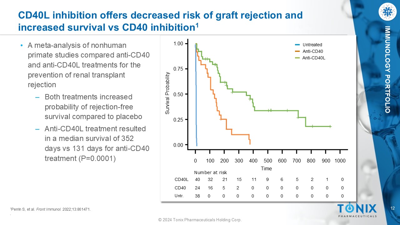 11 © 2024 Tonix Pharmaceuticals Holding Corp. IMMUNOLOGY PORTFOLIO CD40L is a Ligand for Both CD40 and CD11b CD40 B Cell Activated CD4+ T cell Anti - CD40L • Anti - CD40L antibodies may offer the advantage of blocking interaction with both CD40 and CD11b Anti - CD40 • Blocking interaction of CD40L and CD11b enhances efficacy of anti - CD40 treatment in prolonging allograft survival 1 ‒ Anti - CD40 antibodies block CD40/CD40L binding, but do not affect CD11b/CD40L binding 1 1 Liu D, et al. Am J Transplant. 2020;202216 - 2225. . Activated Antigen Presenting Cell CD11b Activated endothelial cell CD40 CD11b CD40 CD40L