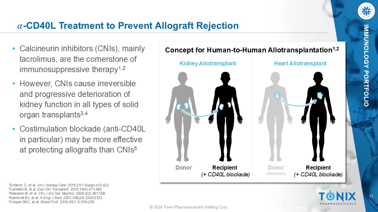 12 © 2024 Tonix Pharmaceuticals Holding Corp. IMMUNOLOGY PORTFOLIO CD40L inhibition offers decreased risk of graft rejection and increased survival vs CD40 inhibition 1 • A meta - analysis of nonhuman primate studies compared anti - CD40 and anti - CD40L treatments for the prevention of renal transplant rejection ‒ Both treatments increased probability of rejection - free survival compared to placebo ‒ Anti - CD40L treatment resulted in a median survival of 352 days vs 131 days for anti - CD40 treatment (P=0.0001) Survival Probability Time 1.00 0.75 0.50 0.25 0.00 0 100 200 300 400 500 600 700 800 900 1000 0 1 2 5 6 9 11 15 21 32 40 CD40L 0 0 0 0 0 0 0 2 5 16 24 CD40 0 0 0 0 0 0 0 0 0 0 38 Untr . Number at risk Untreated Anti - CD40 Anti - CD40L 1 Perrin S, et al. Front Immunol. 2022;13:861471. .