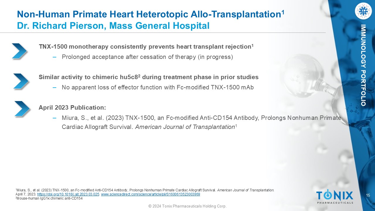 14 © 2024 Tonix Pharmaceuticals Holding Corp. IMMUNOLOGY PORTFOLIO Non - Human Primate Kidney Allo - Transplantation 1 Dr. Tatsuo Kawai, Mass General Hospital TNX - 1500 monotherapy consistently prevents kidney transplant rejection ‒ Superior to results with conventional triple drug immunosuppressive regimen 2 No thrombosis observed ‒ Thrombosis was observed with hu5c8 in prior studies April 2023 Publication: ‒ Lassiter, G., et al. (2023). TNX - 1500, an Fc - modified Anti - CD154 Antibody, Prolongs Nonhuman Primate Renal Allograft Survival. American Journal of Transplantation . 1 1 Lassiter, G., et al. (2023). TNX - 1500, an Fc - modified Anti - CD154 Antibody, Prolongs Nonhuman Primate Renal Allograft Survival. American Journal of Transplantation . April 7, 2023. https://doi.org/10.1016/j.ajt.2023.03.022 . www.sciencedirect.com/science/article/pii/S1600613523003714 2 Tacrolimus, MMF and steroids