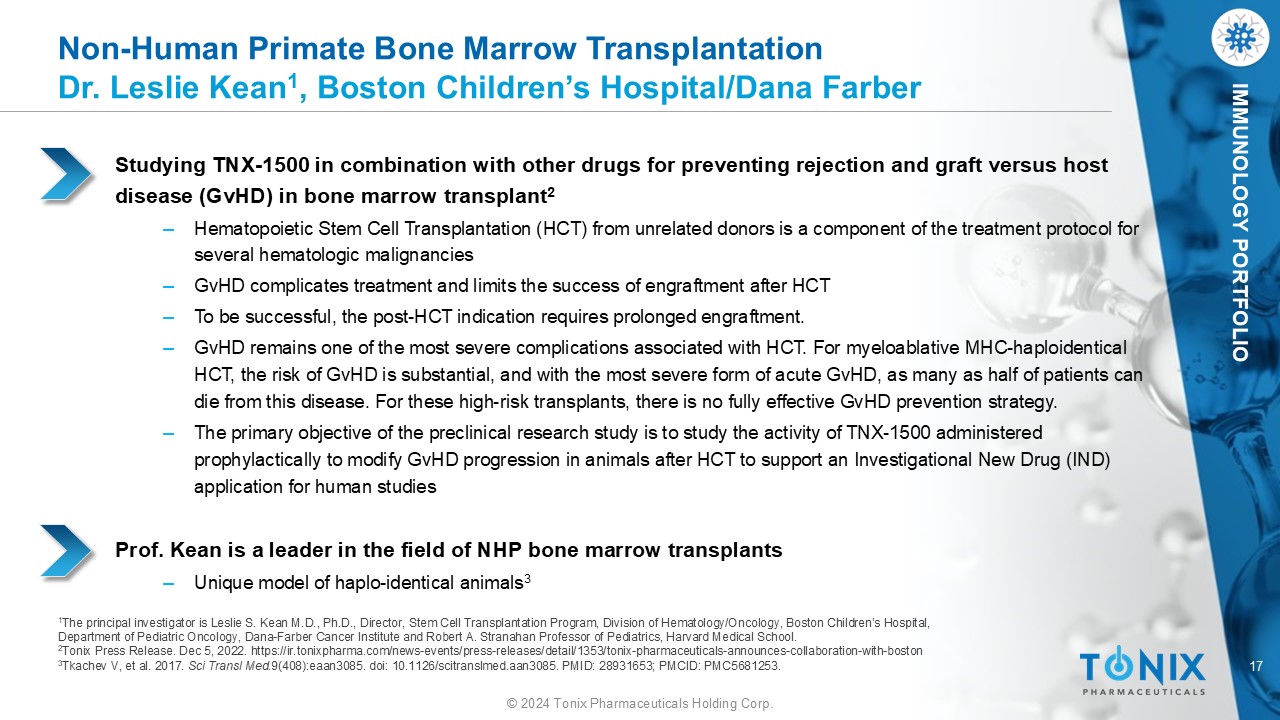 16 © 2024 Tonix Pharmaceuticals Holding Corp. IMMUNOLOGY PORTFOLIO Non - Human Primate Kidney Xenograft Transplantation Dr. Tatsuo Kawai, Mass General Hospital TNX - 1500 therapy is part of a regiment to prevent rejection in kidney xenograft transplants ‒ Prolonged acceptance October 11, 2023 - Publication and news coverage in Nature ‒ Anand, R.P., Layer, J.V., Heja , D. et al. Design and testing of a humanized porcine donor for xenotransplantation. Nature 622, 393 – 401 (2023). https://doi.org/10.1038/s41586 - 023 - 06594 - 4 Design and testing of a humanized porcine donor for xenotransplantation | Nature 1 ‒ Kozlov, M. Oct 11, 2023 News: “Monkey survives two years after gene - edited pig - kidney transplant” Nature : Monkey survives for two years after gene - edited pig kidney transplant (nature.com) ‒ Mohiuddin, M. Oct 11, 2023 Nature . News and Views. “Pig - to - primate organ transplants require genetic modifications of donor.” News and Views. : Pig - to - primate organ transplants require genetic modifications of donor (nature.com) 1 In Table 1, I see four TNX - 1500 treated animals: M8220, M6421, M12621, M5722