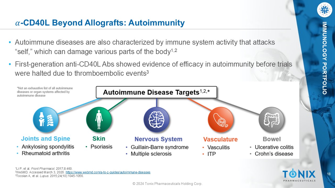 17 © 2024 Tonix Pharmaceuticals Holding Corp. IMMUNOLOGY PORTFOLIO Non - Human Primate Bone Marrow Transplantation Dr. Leslie Kean 1 , Boston Children’s Hospital/Dana Farber Studying TNX - 1500 in combination with other drugs for preventing rejection and graft versus host disease (GvHD) in bone marrow transplant 2 ‒ Hematopoietic Stem Cell Transplantation (HCT) from unrelated donors is a component of the treatment protocol for several hematologic malignancies ‒ GvHD complicates treatment and limits the success of engraftment after HCT ‒ To be successful, the post - HCT indication requires prolonged engraftment. ‒ GvHD remains one of the most severe complications associated with HCT. For myeloablative MHC - haploidentical HCT, the risk of GvHD is substantial, and with the most severe form of acute GvHD, as many as half of patients can die from this disease. For these high - risk transplants, there is no fully effective GvHD prevention strategy. ‒ The primary objective of the preclinical research study is to study the activity of TNX - 1500 administered prophylactically to modify GvHD progression in animals after HCT to support an Investigational New Drug (IND) application for human studies Prof. Kean is a leader in the field of NHP bone marrow transplants ‒ Unique model of haplo - identical animals 3 1 The principal investigator is Leslie S. Kean M.D., Ph.D., Director, Stem Cell Transplantation Program, Division of Hematology /On cology, Boston Children’s Hospital, Department of Pediatric Oncology, Dana - Farber Cancer Institute and Robert A. Stranahan Professor of Pediatrics, Harvard Medical School. 2 Tonix Press Release. Dec 5, 2022. https://ir.tonixpharma.com/news - events/press - releases/detail/1353/tonix - pharmaceuticals - announ ces - collaboration - with - boston 3 Tkachev V, et al. 2017. Sci Transl Med .9(408):eaan3085. doi : 10.1126/scitranslmed.aan3085. PMID: 28931653; PMCID: PMC5681253.