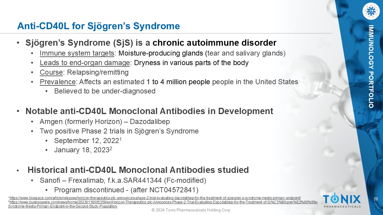 19 © 2024 Tonix Pharmaceuticals Holding Corp. IMMUNOLOGY PORTFOLIO Anti - CD40L for Systemic Lupus Erythematosus (SLE) • SLE is a chronic autoimmune condition • Immune system targets : M ultiple systems, including the skin, joints, kidneys, heart, lungs, brain, and blood vessels • Leads to end - organ damage : Affected organs including kidney disease • Course : Relapsing/remitting • Prevalence : Affects an estimated 1.5 million people in the United States • More common in women • Notable anti - CD40L Monoclonal Antibodies in Development • UCB and Biogen Joint Venture – Dapirolizumab pegol (pegylated Fab) • Phase 3 Trial (NCT04294667) • Topline results reported at ACR 2024 1 • Sanofi – Frexalimab , f.k.a. SAR441344 (Fc - modified) • Phase 2 Trial Currently Enrolling in SLE (NCT05039840) • Historical anti - CD40L Monoclonal Antibodies studied 2 - 4 1 https://investors.biogen.com/news - releases/news - release - details/dapirolizumab - pegol - phase - 3 - data - presented - american - college 2 Huang W, et al. Arthritis Rheum . 2002;46(6):1554 - 1562. 3 Boumpas DT, et al. Arthritis Rheum . 2003;48(3):719 - 727. 4 Grammer AC, et al. J Clin Invest . 2003;112(10):1506 - 1520 .