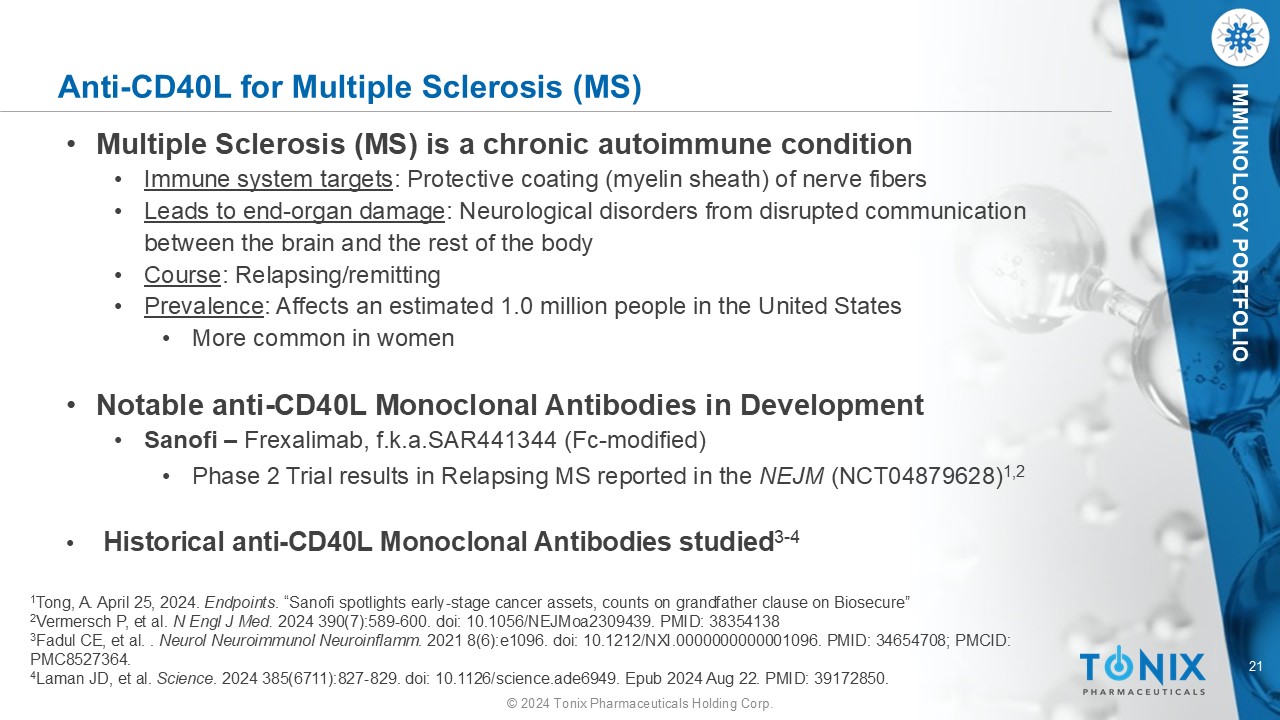 20 © 2024 Tonix Pharmaceuticals Holding Corp. IMMUNOLOGY PORTFOLIO Anti - CD40L for Sjögren’s Syndrome 1 https://www.biospace.com/article/releases/horizon - therapeutics - plc - announces - phase - 2 - trial - evaluating - dazodalibep - for - the - treatm ent - of - sjoegren - s - syndrome - meets - primary - endpoint/ 2 https://www.businesswire.com/news/home/20230118005359/en/Horizon - Therapeutics - plc - Announces - Phase - 2 - Trial - Evaluating - Dazodalibep - for - the - Treatment - of - Sj%C3%B6gren%E2%80%99s - Syndrome - Meets - Primary - Endpoint - in - the - Second - Study - Population - • Sjögren’s Syndrome ( SjS ) is a chronic autoimmune disorder • Immune system targets : Moisture - producing glands ( tear and salivary glands) • Leads to end - organ damage : Dryness in various parts of the body • Course : Relapsing/remitting • Prevalence : Affects an estimated 1 to 4 million people people in the United States • Believed to be under - diagnosed • Notable anti - CD40L Monoclonal Antibodies in Development • Amgen ( formerly Horizon) – Dazodalibep • Two positive Phase 2 trials in Sjögren’s Syndrome • September 12, 2022 1 • January 18, 2023 2 • Historical anti - CD40L Monoclonal Antibodies studied • Sanofi – Frexalimab , f.k.a. SAR441344 (Fc - modified) • Program discontinued - (after NCT04572841)
