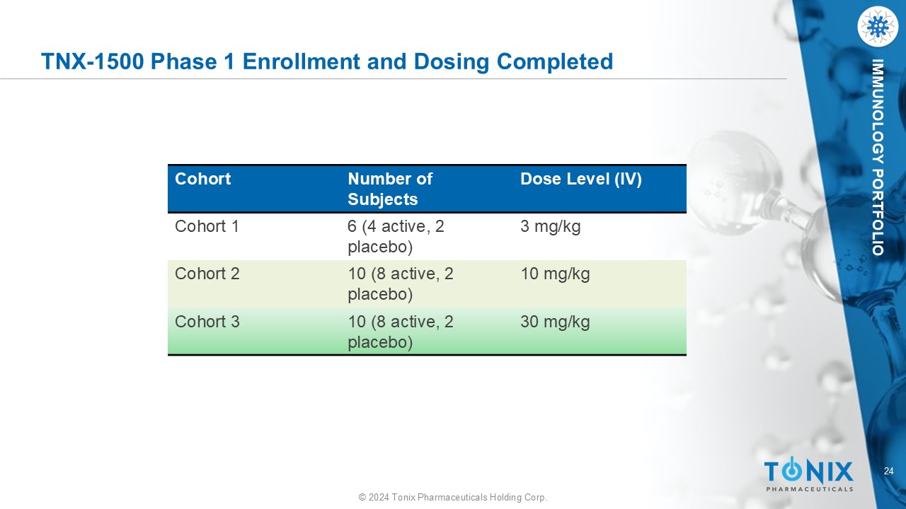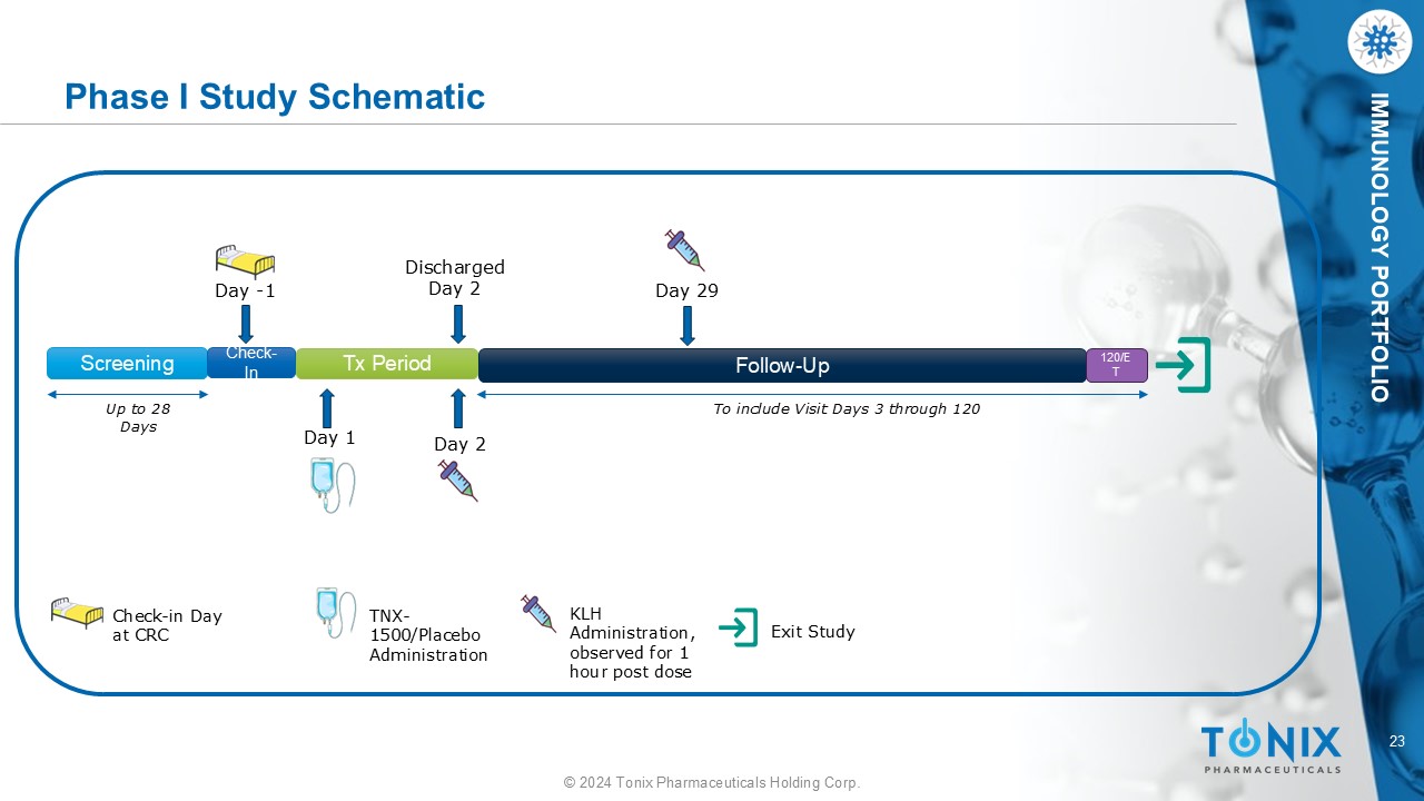 23 © 2024 Tonix Pharmaceuticals Holding Corp. IMMUNOLOGY PORTFOLIO Phase I Study Schematic Day - 1 Tx Period Day 1 Screening Day 2 Check - In Up to 28 Days Follow - Up 120/E T To include Visit Days 3 through 120 Discharged Day 2 Day 29 Check - in Day at CRC TNX - 1500/Placebo Administration KLH Administration, observed for 1 hour post dose Exit Study