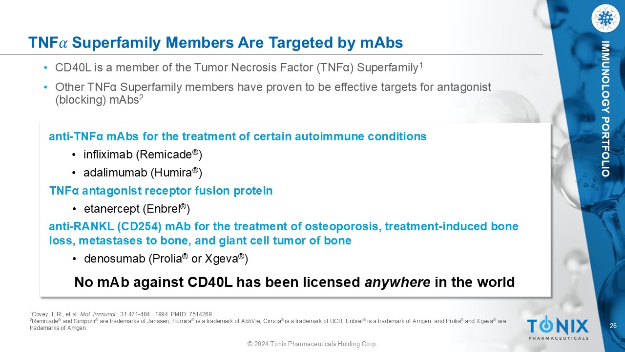 25 © 2024 Tonix Pharmaceuticals Holding Corp. - Confidential IMMUNOLOGY PORTFOLIO TNX - 1500 Strategy and Status Third Indication (and beyond): Autoimmune Diseases ( e.g., Multiple Sclerosis, Sjögen’s Syndrome, Systemic Lupus Erythematosus) • These indications require large studies, but represent large target markets Proposed Initial Indication: Prevention of Allograft Rejection Status: Phase 1 enrollment and dosing complete • Collaborations ongoing with Mass General Hospital on heart and kidney transplantation in non - human primates • Collaboration with Boston Children’s on bone marrow transplantation in non - human primates Next Steps: Initiate Phase 2 study in Kidney Transplant Recipients 1 2 Second Indication: Hematopoietic Cell Transplant (Bone Marrow Transplant) • Potential to reduce GvHD 3