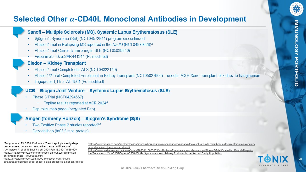 27 © 2024 Tonix Pharmaceuticals Holding Corp. IMMUNOLOGY PORTFOLIO 2020 October 2021 March - April Momenta acquired by Johnson & Johnson for $6.5B 1 • Nipocalimab (M281) is a clinically validated anti - FcRn antibody with a rare pediatric disease designation from the US FDA • J&J called nipocalimab “a pipeline in a product” Viela Bio acquired by Horizon for $3B 3 • UPLIZNA ® ( inebilizumab - cdon ) is an anti - CD19 (B - cell - depleting) antibody approved for the treatment of neuromyelitis optica spectrum disorder (NMOSD), which is a rare and severe autoimmune disease • VIB4920 anti - CD40L is Viela’s second program Kymab acquired by Sanofi for $1.1B 2 • mAb anti - Ox40L for the treatment of autoimmune disease 1 Johnson & Johnson. October 1, 2020. Accessed June 3, 2021. https://www.jnj.com/johnson - johnson - completes - acquisition - of - momenta - pharmaceuticals - inc 2 Sanofi. April 9, 2021. “Sanofi completes Kymab acquisition. www.sanofi.com/en/media - room/press - releases/2021/2021 - 04 - 09 - 05 - 00 - 00 - 2207173 . 3 Horizon. March 15, 2021. “Horizon Therapeutics plc completes acquisition of Viela Bio, Inc. https://ir.horizontherapeutics.com/news - releases/news - release - details/horizon - therapeutics - plc - completes - acquisition - viela - bio - inc 4 BioSpace. March 29, 2022. Accessed March 29, 2022. https://www.biospace.com/article/sanofi - and - igm - partner - on - oncology - and - immunology - in - deal - worth - more - than - 6 - billion/ Recent mAb Transactions 2022 March Sanofi and IGM Biosciences announce collaboration deal that could surpass $6B 4 • The two companies will partner on immunoglobulin M (IgM) antibody agonists against three cancer targets and three immunology/inflammation targets Horizon acquired by Amgen for $27.8B 6 – Lead Drugs: • Krystexxa ® ( pegloticase ) - Gout • Tepezza ® ( teprotumumab ) mAb anti - IGF - 1R – Grave’s Disease • Dazodalibep (tn03 fusion protein) Anti - CD40L – Sjögren's Syndrome Merck announces plan to acquire Prometheus for $10.8B 5 • Two mAbs targeting TNF family members:TL1A (PRA - 023) and CD30L (PRA - 052) for the treatment of inflammatory bowel disease and other autoimmune conditions 2023 April - October 5 April 16, 2023. Merck. “Merck strengthens immunology pipeline with acquisition of Prometheus Biosciences” www.merck.com/news/merck - strengthens - immunology - pipeline - with - acquisition - of - prometheus - biosciences - inc/ 6 Endpoints News. October 6, 2023. “Amgen closes $28B Horizon acquisition a month after FTC battle ended.” https://endpts.com/breaking - amgen - seals - 28b - horizon - acquisition - a - month - after - ftc - battle - ended/ Sanofi and Teva to co - develop anti - TL1A in $1.5B deal 7 • Anti - TL1A mAb for inflammatory bowel disease 7 BioSpace. October 4, 2023. “Sanofi, Teva Ink Potential $1.5B Deal Aimed at Blockbuster IBD Drug” . https://www.biospace.com/article/sanofi - teva/
