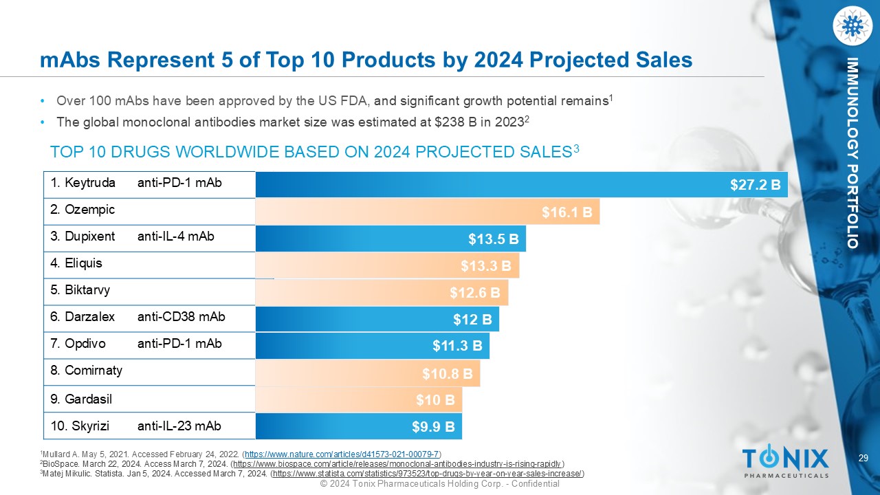 29 © 2024 Tonix Pharmaceuticals Holding Corp. - Confidential IMMUNOLOGY PORTFOLIO mAbs Represent 5 of Top 10 Products by 2024 Projected Sales • Over 100 mAbs have been approved by the US FDA, and significant growth potential remains 1 • The global monoclonal antibodies market size was estimated at $238 B in 2023 2 TOP 10 DRUGS WORLDWIDE BASED ON 2024 PROJECTED SALES 3 1 Mullard A. May 5, 2021. Accessed February 24, 2022. ( https://www.nature.com/articles/d41573 - 021 - 00079 - 7 ) 2 BioSpace. March 22, 2024. Access March 7, 2024. ( https://www.biospace.com/article/releases/monoclonal - antibodies - industry - is - rising - rapidly ) 3 Matej Mikulic . Statista. Jan 5 , 202 4. Accessed March 7, 2024. ( https://www.statista.com/statistics/973523/top - drugs - by - year - on - year - sales - increase/ ) anti - PD - 1 mAb 1. Keytruda 2. Ozempic anti - IL - 4 mAb 3. Dupixent 4. Eliquis 5. Biktarvy anti - CD38 mAb 6. Darzalex anti - PD - 1 mAb 7. Opdivo 8. Comirnaty 9. Gardasil anti - IL - 23 mAb 10. Skyrizi $27.2 B $16.1 B $13.3 B $13.5 B $12.6 B $12 B $11.3 B $10.8 B $10 B $9.9 B