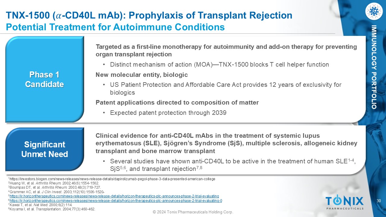 30 © 2024 Tonix Pharmaceuticals Holding Corp. IMMUNOLOGY PORTFOLIO TNX - 1500 ( ߙ - CD40L mAb ): Prophylaxis of Transplant Rejection Potential Treatment for Autoimmune Conditions Phase 1 Candidate Significant Unmet Need Targeted as a first - line monotherapy for autoimmunity and add - on therapy for preventing organ transplant rejection • Distinct mechanism of action (MOA) — TNX - 1500 blocks T cell helper function New molecular entity, biologic • US Patient Protection and Affordable Care Act provides 12 years of exclusivity for biologics Patent applications directed to composition of matter • Expected patent protection through 2039 Clinical evidence for anti - CD40L mAbs in the treatment of systemic lupus erythematosus (SLE), Sjögren’s Syndrome ( SjS ), multiple sclerosis, allogeneic kidney transplant and bone marrow transplant • Several studies have shown anti - CD40L to be active in the treatment of human SLE 1 - 4 , SjS 5,6 , and transplant rejection 7,8 1 https://investors.biogen.com/news - releases/news - release - details/dapirolizumab - pegol - phase - 3 - data - presented - american - college 2 Huang W, et al. Arthritis Rheum . 2002;46(6):1554 - 1562. 3 Boumpas DT, et al. Arthritis Rheum . 2003;48(3):719 - 727. 4 Grammer AC, et al. J Clin Invest . 2003;112(10):1506 - 1520 . 5 https://ir.horizontherapeutics.com/news - releases/news - release - details/horizon - therapeutics - plc - announces - phase - 2 - trial - evaluatin g 6 https://ir.horizontherapeutics.com/news - releases/news - release - details/horizon - therapeutics - plc - announces - phase - 2 - trial - evaluatin g - 0 7 Kawai T, et al. Nat Med . 2000;6(2):114. 8 Koyama I, et al. Transplantation . 2004;77(3):460 - 462.