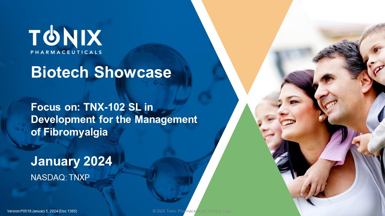 © 2024 Tonix Pharmaceuticals Holding Corp. Biotech Showcase Focus on: TNX - 102 SL in Development for the Management of Fibromyalgia January 2024 NASDAQ: TNXP Version P0519 January 5 , 2024 (Doc 1365 )