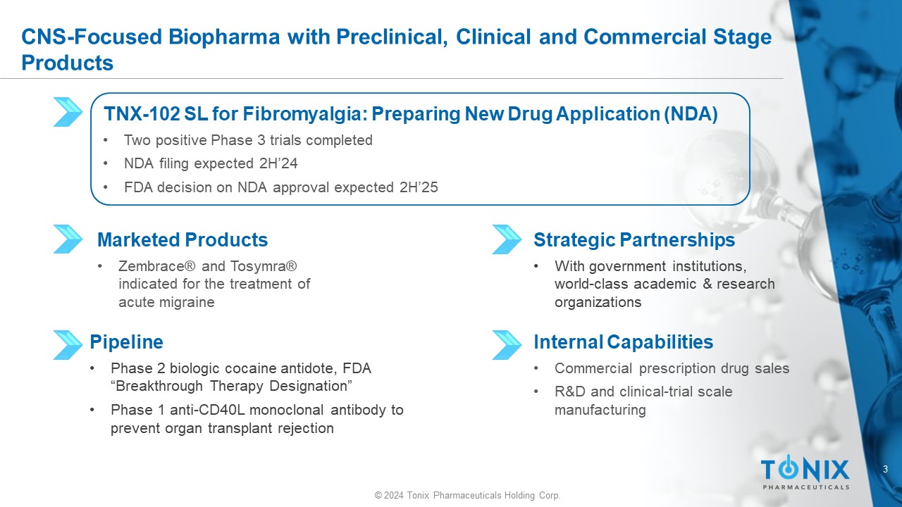2 © 2024 Tonix Pharmaceuticals Holding Corp. Cautionary Note on Forward - Looking Statements Certain statements in this presentation regarding strategic plans, expectations and objectives for future operations or results are “forward - looking statements” as defined by the Private Securities Litigation Reform Act of 1995. These statements may be identified by the use of forward - looking words such as “anticipate,” “believe,” “forecast,” “estimate” and “intend,” among others. These forward - looking statements are based on Tonix’s current expectations and actual results could differ materially. There are a number of factors that could cause actual events to differ materially from those indicated by such forward - looking statements. These factors include, but are not limited to, the risks related to failure to obtain FDA clearances or approvals and noncompliance with FDA regulations; risks related to the failure to successfully market any of our products; risks related to the timing and progress of clinical development of our product candidates; our need for additional financing; uncertainties of patent protection and litigation; uncertainties of government or third party payor reimbursement; limited research and development efforts and dependence upon third parties; and substantial competition. As with any pharmaceutical under development, there are significant risks in the development, regulatory approval and commercialization of new products. The forward - looking statements in this presentation are made as of the date of this presentation, even if subsequently made available by Tonix on its website or otherwise. Tonix does not undertake an obligation to update or revise any forward - looking statement, except as required by law. Investors should read the risk factors set forth in the Annual Report on Form 10 - K for the year ended December 31, 2022, as filed with the Securities and Exchange Commission (the “SEC”) on March 13, 2023, and periodic reports and current reports filed with the SEC on or after the date thereof. All of Tonix's forward - looking statements are expressly qualified by all such risk factors and other cautionary statements.