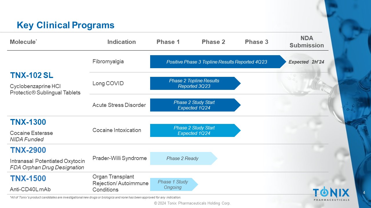 3 © 2024 Tonix Pharmaceuticals Holding Corp. CNS - Focused Biopharma with Preclinical, Clinical and Commercial Stage Products Marketed Products • Zembrace ® and Tosymra ® indicated for the treatment of acute migraine TNX - 102 SL for Fibromyalgia: Preparing New Drug Application (NDA) • Two positive Phase 3 trials completed • NDA filing expected 2H’24 • FDA decision on NDA approval expected 2H’25 Internal Capabilities • Commercial prescription drug sales • R&D and clinical - trial scale manufacturing Strategic Partnerships • With government institutions, world - class academic & research organizations Pipeline • Phase 2 biologic cocaine antidote, FDA “Breakthrough Therapy Designation” • Phase 1 anti - CD40L monoclonal antibody to prevent organ transplant rejection