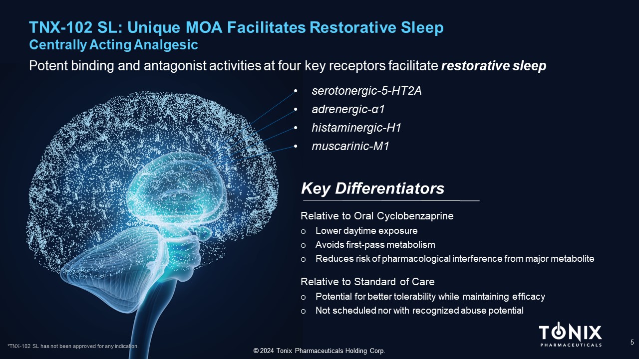 4 © 2024 Tonix Pharmaceuticals Holding Corp. Key Clinical Programs *All of Tonix’s product candidates are investigational new drugs or biologics and none has been approved for any indication. NDA Submission Phase 3 Phase 2 Phase 1 Indication Molecule * Fibromyalgia TNX - 102 SL Cyclobenzaprine HCl Protectic ® Sublingual Tablets Long COVID Acute Stress Disorder Cocaine Intoxication TNX - 1300 Cocaine Esterase NIDA Funded Prader - Willi Syndrome TNX - 2900 Intranasal Potentiated Oxytocin FDA Orphan Drug Designation Organ Transplant Rejection/ Autoimmune Conditions TNX - 1500 Anti - CD40L mAb Positive Phase 3 Topline Results Reported 4Q’23 Phase 2 Study Start Expected 1Q’24 Phase 1 Study Ongoing Expected 2H’24 Phase 2 Ready Phase 2 Topline Results Reported 3Q’23 Phase 2 Study Start Expected 1Q’24
