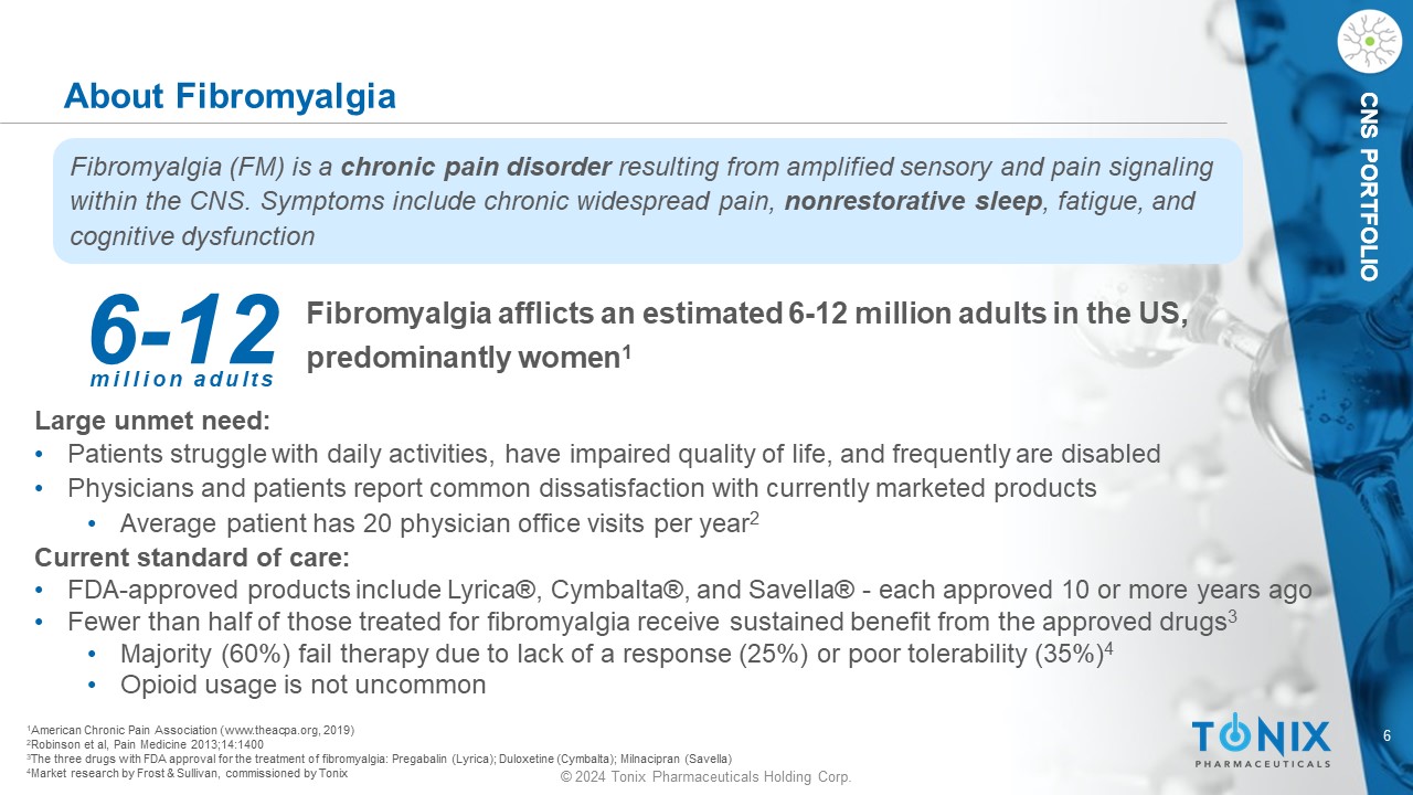 TNX - 102 SL: Unique MOA Facilitates Restorative Sleep Centrally Acting Analgesic 5 Potent binding and antagonist activities at four key receptors facilitate restorative sleep • serotonergic - 5 - HT2A • adrenergic - α1 • histaminergic - H1 • muscarinic - M1 Relative to Oral Cyclobenzaprine o Lower daytime exposure o Avoids first - pass metabolism o Reduces risk of pharmacological interference from major metabolite Relative to Standard of Care o Potential for better tolerability while maintaining efficacy o Not scheduled nor with recognized abuse potential Key Differentiators © 2024 Tonix Pharmaceuticals Holding Corp. *TNX - 102 SL has not been approved for any indication.
