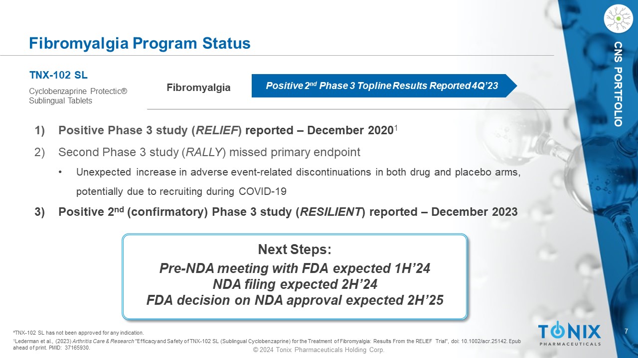 6 © 2024 Tonix Pharmaceuticals Holding Corp. CNS PORTFOLIO CNS PORTFOLIO Fibromyalgia a fflicts an estimated 6 - 12 million adults in the US, predominantly women 1 1 American Chronic Pain Association (www.theacpa.org, 2019) 2 Robinson et al, Pain Medicine 2013;14:1400 3 The three drugs with FDA approval for the treatment of fibromyalgia: Pregabalin (Lyrica); Duloxetine (Cymbalta); Milnacipran ( Savella ) 4 Market research by Frost & Sullivan, commissioned by Tonix About Fibromyalgia Fibromyalgia (FM) is a chronic pain disorder resulting from amplified sensory and pain signaling within the CNS. Symptoms include chronic widespread pain, nonrestorative sleep , fatigue, and cognitive dysfunction 6 - 12 million adults Large unmet need: • Patients struggle with daily activities, have impaired quality of life, and frequently are disabled • Physicians and patients report common dissatisfaction with currently marketed products • Average patient has 20 physician office visits per year 2 Current standard of care: • FDA - approved products include Lyrica®, Cymbalta®, and Savella ® - each approved 10 or more years ago • Fewer than half of those treated for fibromyalgia receive sustained benefit from the approved drugs 3 • Majority (60%) fail therapy due to lack of a response (25%) or poor tolerability (35%) 4 • Opioid usage is not uncommon